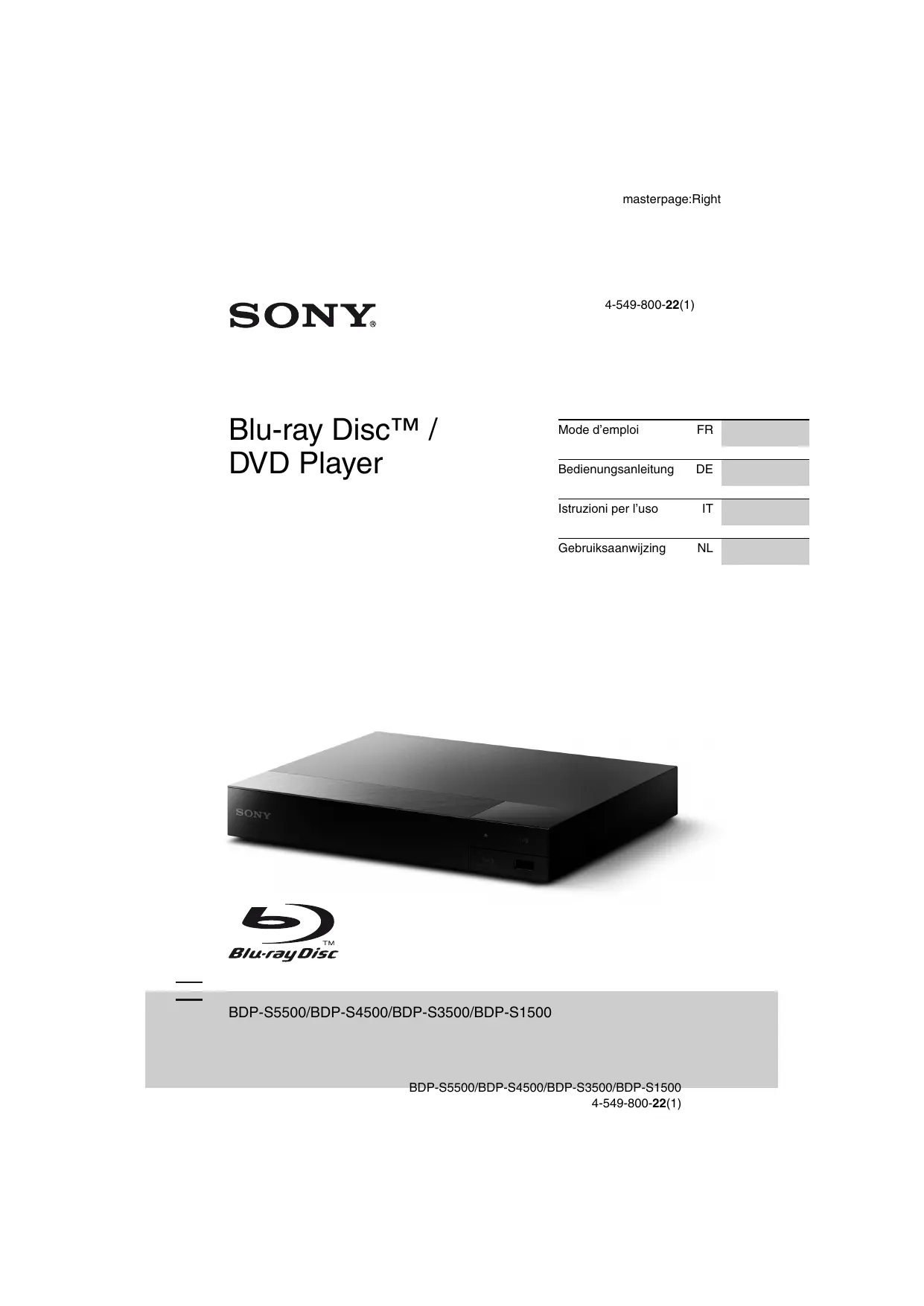 Téléchargez la notice de votre Lecteur blu-ray au format PDF gratuitement ! Retrouvez votre notice BDP S4500 - SONY et reprennez votre appareil électronique en main. Sur cette page sont publiés tous les documents nécessaires à l'utilisation de votre appareil BDP S4500 de la marque SONY.