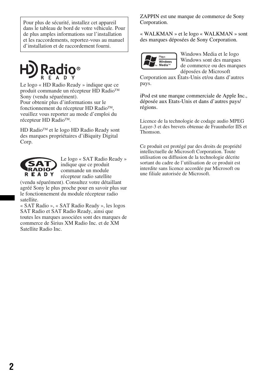 RE À D Y Le logo « HD Radio Ready » indique que ce produit commande un récepteur HD Radio!" Sony (vendu séparément) Pour obtenir plus d'informations sur le fonctionnement du récepteur HD Radio", veuillez vous reporter au mode d'emploi du récepteur HD Radio®,