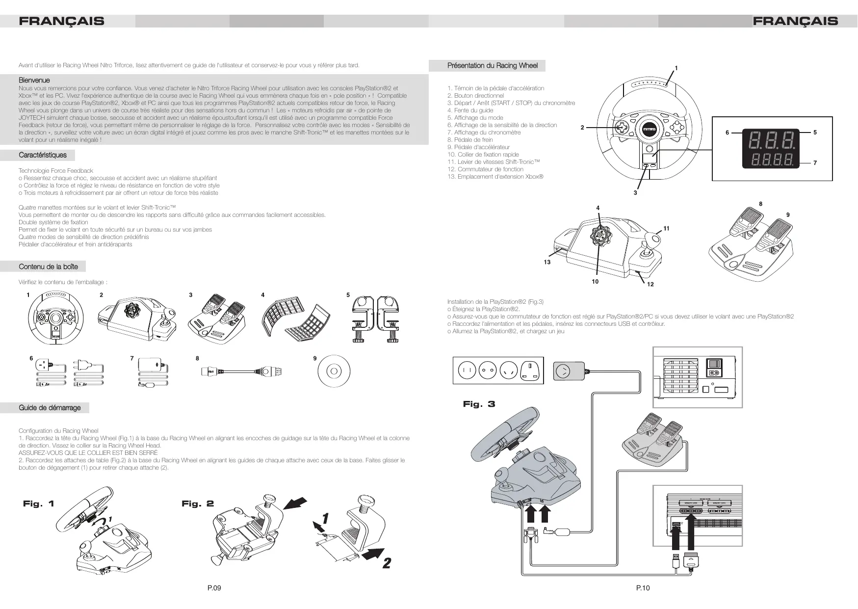Avant d'utiliser le Racing Wheel Nitro Triforce, lisez attentivement ce guide de l'utilisateur et conservez-le pour vous y référer plus tard. Présentation du Racing Wheel Bienvenue Nous vous remercions pour votre confiance. Vous venez d'acheter le Nitro Triforce Racing Wheel pour utilisation avec les consoles PlayStation®2 et Xbox™ et les PC. Vivez l'expérience authentique de la course avec le Racing Wheel qui vous emmènera chaque fois en « pole position » ! Compatible avec les jeux de course PlayStation®2, Xbox® et PC ainsi que tous les programmes PlayStation®2 actuels compatibles retour de force, le Racing Wheel vous plonge dans un univers de course très réaliste pour des sensations hors du commun ! Les « moteurs refroidis par air » de pointe de JOYTECH simulent chaque bosse, secousse et accident avec un réalisme époustouflant lorsqu'il est utilisé avec un programme compatible Force Feedback (retour de force), vous permettant même de personnaliser le réglage de la force. Personnalisez votre contrôle avec les modes « Sensibilité de la direction », surveillez votre voiture avec un écran digital intégré et jouez comme les pros avec le manche Shift-Tronic™ et les manettes montées sur le volant pour un réalisme inégalé ! Caractéristiques Technologie Force Feedback o Ressentez chaque choc, secousse et accident avec un réalisme stupéfiant o Contrôlez la force et réglez le niveau de résistance en fonction de votre style o Trois moteurs à refroidissement par air offrent un retour de force très réaliste