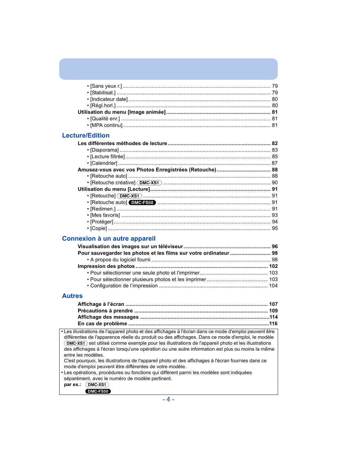 • Les opérations, procédures ou fonctions qui diffèrent parmi les modèles sont indiquées séparément, avec le numéro de modèle pertinent. par ex.: (DMC-XS1) (DMC-FS50)