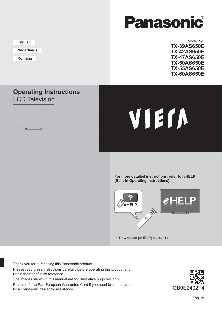 Retrouvez gratuitement la notice de l'appareil TX-47AS650E PANASONIC au format PDF.
