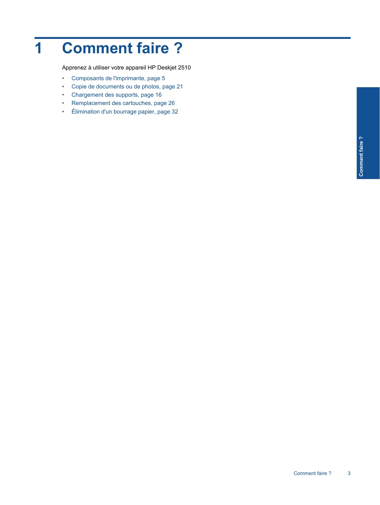 Composants de l'imprimante, page 5 Copie de documents ou de photos, page 21 Chargement des supports, page 16 Remplacement des cartouches, page 26 Élimination d'un bourrage papier, page 32 Comment faire ?