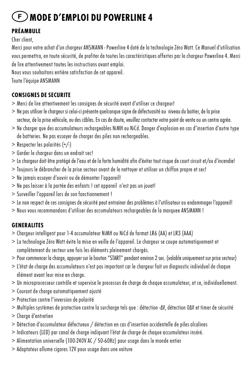 F Mode d’emploi du POWERLINE 4 Préambule Cher client, Merci pour votre achat d’un chargeur ANSMANN - Powerline 4 doté de la technologie Zéro Watt. Ce Manuel d’utilisation vous permettra, en toute sécurité, de profiter de toutes les caractéristiques offertes par le chargeur Powerline 4. Merci de lire attentivement toutes les instructions avant emploi. Nous vous souhaitons entière satisfaction de cet appareil. Toute l’équipe ANSMANN CONSIGNES DE SECURITE > Merci de lire attentivement les consignes de sécurité avant d’utiliser ce chargeur! > Ne pas utiliser le chargeur si celui-ci présente quelconque signe de défectuosité au niveau du boitier, de la prise secteur, de la prise véhicule, ou des câbles. En cas de doute, veuillez contacter votre point de vente ou un centre agrée. > Ne charger que des accumulateurs rechargeables NiMH ou NiCd. Danger d’explosion en cas d’insertion d’autre type de batteries. Ne pas essayer de charger des piles non rechargeables. > Respecter les polarités (+/-) > Garder le chargeur dans un endroit sec! > Le chargeur doit être protégé de l’eau et de la forte humidité afin d’éviter tout risque de court circuit et/ou d’incendie! > Toujours le débrancher de la prise secteur avant de le nettoyer et utiliser un chiffon propre et sec! > Ne jamais essayer d’ouvrir ou de démonter l’appareil! > Ne pas laisser à la portée des enfants ! cet appareil n’est pas un jouet! > Surveiller l’appareil lors de son fonctionnement ! > Le non respect de ces consignes de sécurité peut entrainer des problèmes à l’utilisateur ou endommager l’appareil! > Nous vous recommandons d’utiliser des accumulateurs rechargeables de la marquee ANSMANN ! GENERALITES > Chargeur intelligent pour 1-4 accumulateur NiMH ou NiCd de format LR6 (AA) et LR3 (AAA) > La technologie Zéro Watt évite la mise en veille de l’appareil. Le chargeur se coupe automatiquement et complètement du secteur une fois les éléments pleinement chargés. > Pour commencer la charge, appuyer sur le bouton “START” pendant environ 2 sec. (valable uniquement sur prise secteur) > L’état de charge des accumulateurs n’est pas important car le chargeur fait un diagnostic individuel de chaque élément avant leur mise en charge. > Un microprocesseur contrôle et supervise le processus de charge de chaque accumulateur, et ce, individuellement. > Courant de charge automatiquement ajusté > Protection contre l’inversion de polarité > Multiples systèmes de protection contre la surcharge tels que : détection -ΔV, détection 0ΔV et timer de sécurité > Charge d’entretien > Détection d’accumulateur défectueux / détection en cas d’insertion accidentelle de piles alcalines > Indicateurs (LED) par canal de charge indiquant l’état de charge de chaque accumulateur inséré. > Alimentation universelle (100-240V AC / 50-60Hz) pour usage dans le monde entier > Adaptateur allume cigares 12V pour usage dans une voiture