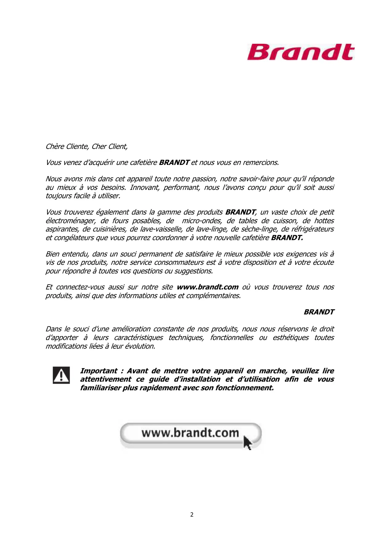 Et connectez-vous aussi sur notre site www.brandt.com où vous trouverez tous nos produits, ainsi que des informations utiles et complémentaires.