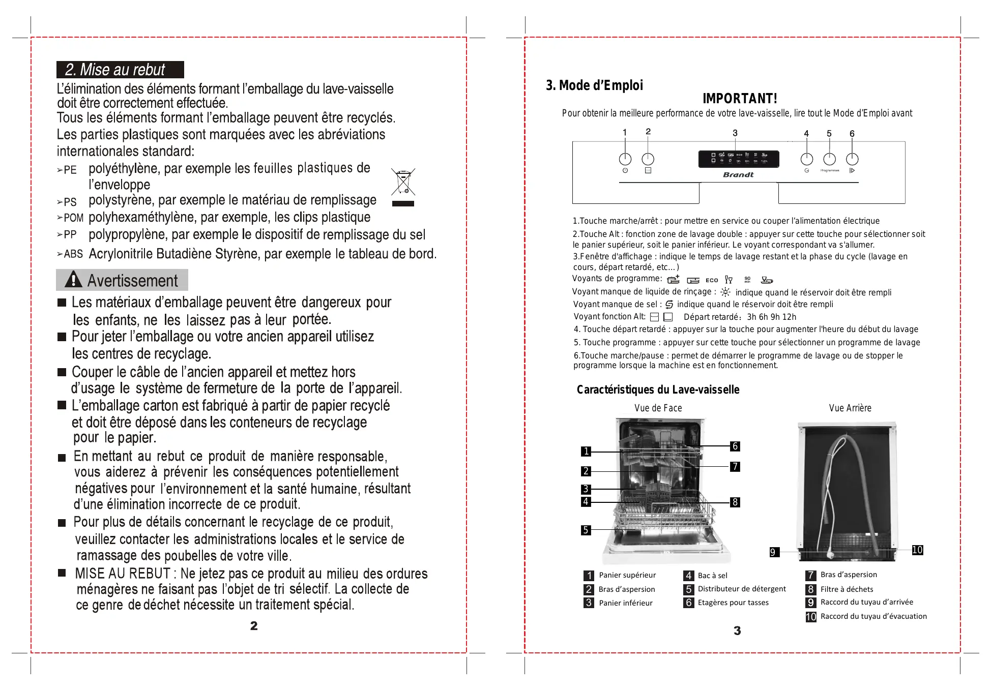 Tableau de commande........................... .............................…..3 Caractéristiques du Lave-vaisselle .............................…...3 Une lecture attentive avant d’utiliser le lave-vaisselle vous aidera à le faire fonctionner et à l’entretenir correctement.