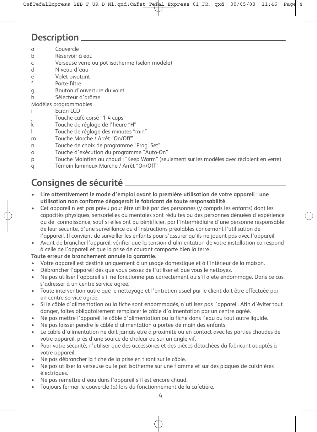 fig.9 11:46 Page 3 CafTefalExpress SEB F UK D Nl.qxd:Cafet Tefal Express 01_FR. qxd 30/05/08 11:46 Page 4 Description Couvercle Réservoir à eau Verseuse verre ou pot isotherme (selon modèle) Niveau d’eau Volet pivotant Porte-filtre Bouton d’ouverture du volet Sélecteur d’arôme Modèles programmables Ecran LCD Touche café corsé “1-4 cups” Touche de réglage de l’heure “H” Touche de réglage des minutes “min” Touche Marche / Arrêt “On/Off” Touche de choix de programme “Prog. Set” Touche d’exécution du programme “Auto-On” Touche Maintien au chaud : “Keep Warm” (seulement sur les modèles avec récipient en verre) Témoin lumineux Marche / Arrêt “On/Off” Consignes de sécurité Lire attentivement le mode d’emploi avant la première utilisation de votre appareil : une utilisation non conforme dégagerait le fabricant de toute responsabilité.