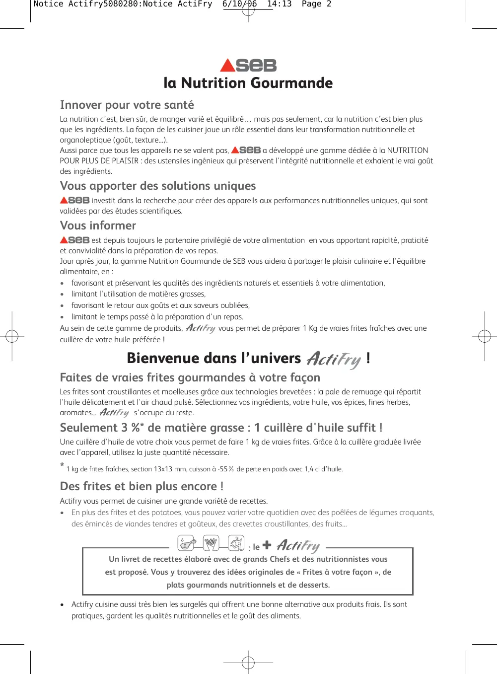 Notice Actifry5080280:Notice ActiFry 3/10/06 17:37 www.groupeseb.com Page c1 Notice Actifry5080280:Notice ActiFry 6/10/06 14:13 Page 2 la Nutrition Gourmande Innover pour votre santé La nutrition c’est, bien sûr, de manger varié et équilibré… mais pas seulement, car la nutrition c’est bien plus que les ingrédients. La façon de les cuisiner joue un rôle essentiel dans leur transformation nutritionnelle et organoleptique (goût, texture...). Aussi parce que tous les appareils ne se valent pas, a développé une gamme dédiée à la NUTRITION POUR PLUS DE PLAISIR : des ustensiles ingénieux qui préservent l’intégrité nutritionnelle et exhalent le vrai goût des ingrédients. Vous apporter des solutions uniques investit dans la recherche pour créer des appareils aux performances nutritionnelles uniques, qui sont validées par des études scientifiques. Vous informer est depuis toujours le partenaire privilégié de votre alimentation en vous apportant rapidité, praticité et convivialité dans la préparation de vos repas. Jour après jour, la gamme Nutrition Gourmande de SEB vous aidera à partager le plaisir culinaire et l’équilibre alimentaire, en :