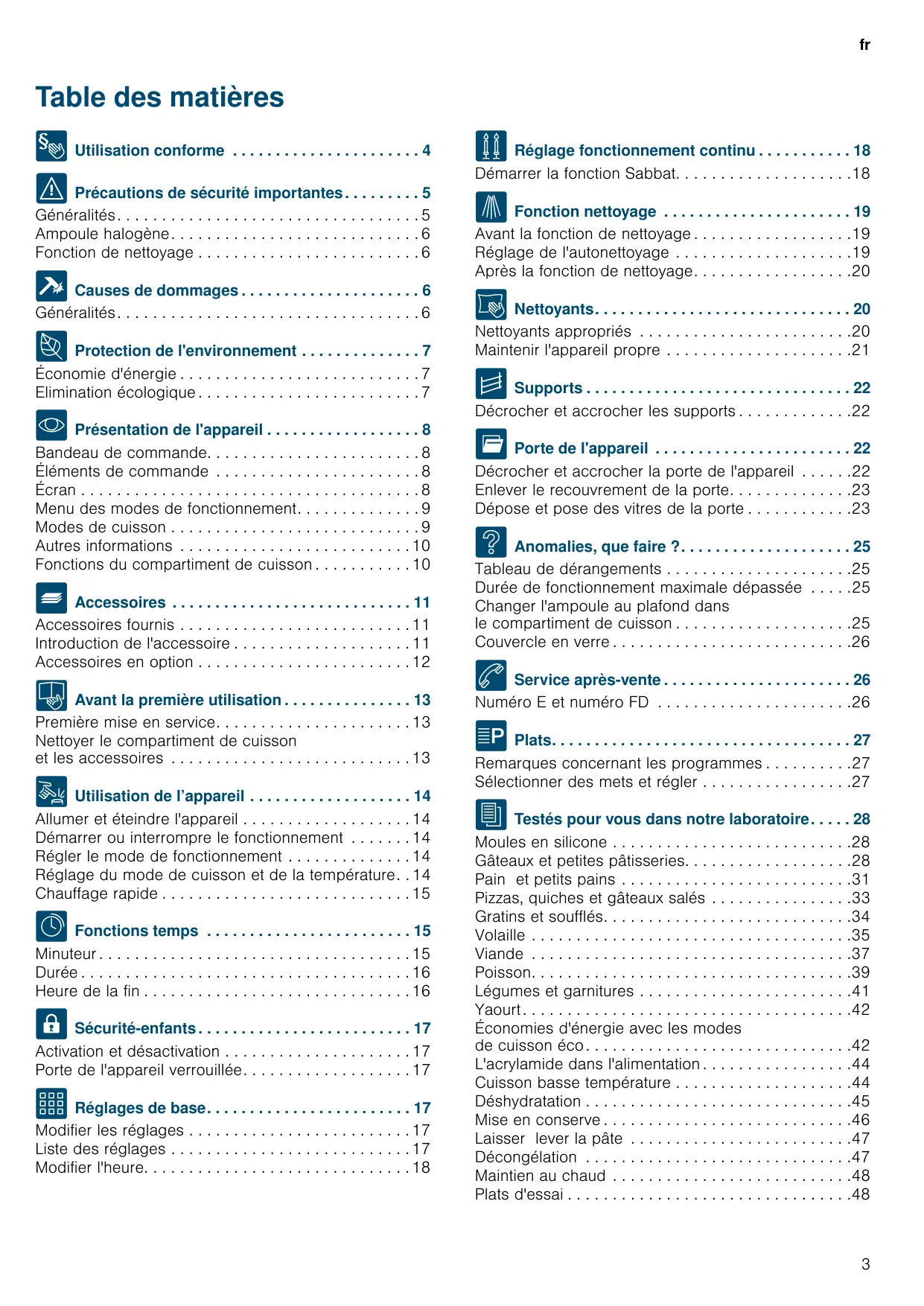 4 Service après-vente . . . . . . . . . . . . . . . . . . . . . . 26 Numéro E et numéro FD . . . . . . . . . . . . . . . . . . . . . .26 P Plats. . . . . . . . . . . . . . . . . . . . . . . . . . . . . . . . . . . 27 Remarques concernant les programmes . . . . . . . . . .27 Sélectionner des mets et régler . . . . . . . . . . . . . . . . .27 J Testés pour vous dans notre laboratoire. . . . . 28 Moules en silicone . . . . . . . . . . . . . . . Gâteaux et petites pâtisseries. . . . . . . Pain et petits pains . . . . . . . . . . . . . . Pizzas, quiches et gâteaux salés . . . . Gratins et soufflés. . . . . . . . . . . . . . . . Volaille . . . . . . . . . . . . . . . . . . . . . . . . Viande . . . . . . . . . . . . . . . . . . . . . . . . Poisson. . . . . . . . . . . . . . . . . . . . . . . . Légumes et garnitures . . . . . . . . . . . . Yaourt . . . . . . . . . . . . . . . . . . . . . . . . . Économies d'énergie avec les modes de cuisson éco . . . . . . . . . . . . . . . . . . L'acrylamide dans l'alimentation . . . . . Cuisson basse température . . . . . . . . Déshydratation . . . . . . . . . . . . . . . . . . Mise en conserve . . . . . . . . . . . . . . . . Laisser lever la pâte . . . . . . . . . . . . . Décongélation . . . . . . . . . . . . . . . . . . Maintien au chaud . . . . . . . . . . . . . . . Plats d'essai . . . . . . . . . . . . . . . . . . . .