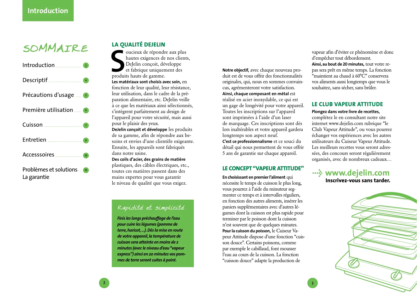 Plongez dans votre livre de recettes, complétez le en consultant notre site internet www.dejelin.com rubrique "le Club Vapeur Attitude", ou vous pourrez échanger vos expériences avec les autres utilisateurs du Cuiseur Vapeur Attitude. Lesassageurs recettes vous seront adressées, des concours seront régulièrement organisés, avec de nombreux caveaux...