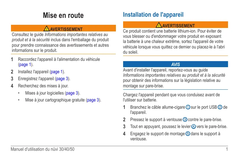 Mise en route AVERTISSEMENT Consultez le guide Informations importantes relatives au produit et à la sécurité inclus dans l'emballage du produit pour prendre connaissance des avertissements et autres informations sur le produit. 1 Raccordez l'appareil à l'alimentation du véhicule (page 1). 2 Installez l'appareil (page 1). 3 Enregistrez l'appareil (page 3). 4 Recherchez des mises à jour.