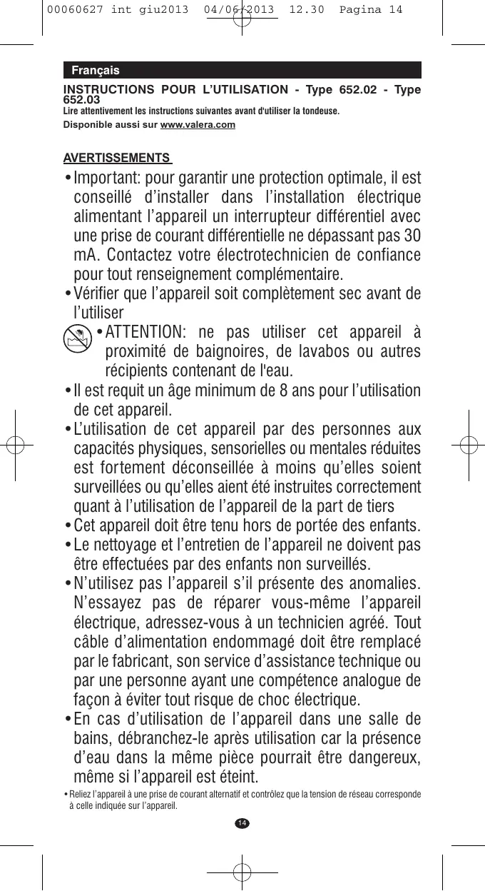 INSTRUCTIONS POUR L’UTILISATION - Type 652.02 - Type 652.03 Lire attentivement les instructions suivantes avant d'utiliser la tondeuse. Disponible aussi sur www.valera.com