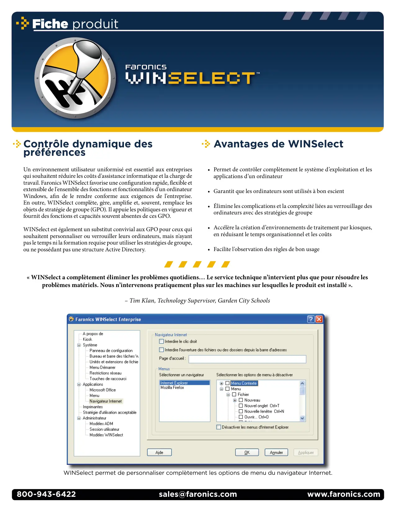 Un environnement utilisateur uniformisé est essentiel aux entreprises qui souhaitent réduire les coûts d'assistance informatique et la charge de travail. Faronics WINSelect favorise une configuration rapide, flexible et extensible de l'ensemble des fonctions et fonctionnalités d'un ordinateur Windows, afin de le rendre conforme aux exigences de l'entreprise. En outre, WINSelect compte, gère, amplifie et, souvent, remplace les objets de strategie de groupe (GPO). Il appuie les politiques en vigueur et fournit des fonctions et capacités souvent absentes de ces GPO.