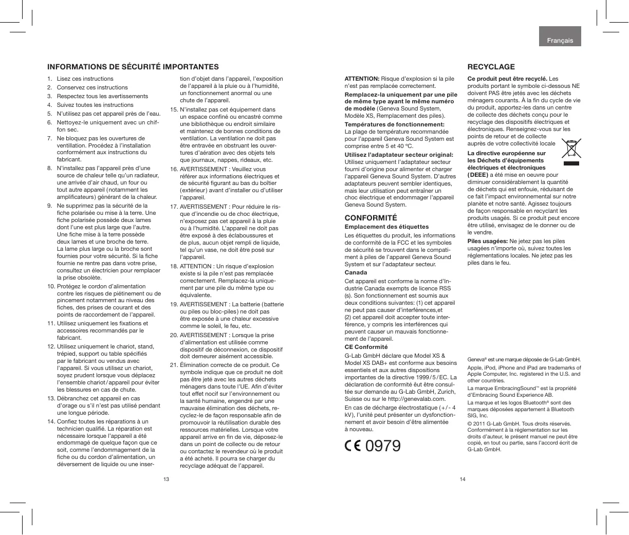 Recyclage ATTENTION: Risque d’explosion si la pile n’est pas remplacée correctement. Remplacez-la uniquement par une pile de même type ayant le même numéro de modèle ( Geneva Sound System, Modèle XS, Remplacement des piles ). Températures de fonctionnement: La plage de température recommandée pour l’appareil Geneva Sound System est comprise entre 5 et 40 ºC. Utilisez l’adaptateur secteur original: Utilisez uniquement l’adaptateur secteur fourni d’origine pour alimenter et charger l’appareil Geneva Sound System. D’autres adaptateurs peuvent sembler identiques, mais leur utilisation peut entraîner un choc électrique et endommager l’appareil Geneva Sound System. Ce produit peut être recyclé. Les produits portant le symbole ci-dessous NE doivent PAS être jetés avec les déchets ménagers courants. À la fin du cycle de vie du produit, apportez-les dans un centre de collecte des déchets conçu pour le recyclage des dispositifs électriques et électroniques. Renseignez-vous sur les points de retour et de collecte auprès de votre collectivité locale La directive européenne sur les Déchets d’équipements électriques et électroniques ( DEEE ) a été mise en oeuvre pour diminuer considérablement la quantité de déchets qui est enfouie, réduisant de ce fait l’impact environnemental sur notre planète et notre santé. Agissez toujours de façon responsable en recyclant les produits usagés. Si ce produit peut encore être utilisé, envisagez de le donner ou de le vendre. Piles usagées: Ne jetez pas les piles usagées n’importe où, suivez toutes les réglementations locales. Ne jetez pas les piles dans le feu. Conformité Emplacement des étiquettes Les étiquettes du produit, les informations de conformité de la FCC et les symboles de sécurité se trouvent dans le compatiment à piles de l’appareil Geneva Sound System et sur l’adaptateur secteur. Canada Cet appareil est conforme la norme d’Industrie Canada exempts de licence RSS (s). Son fonctionnement est soumis aux deux conditions suivantes: (1) cet appareil ne peut pas causer d’interférences,et (2) cet appareil doit accepter toute interférence, y compris les interférences qui peuvent causer un mauvais fonctionnement de l’appareil. CE Conformité G-Lab GmbH déclare que Model XS & Model XS DAB+ est conforme aux besoins essentiels et aux autres dispositions importantes de la directive 1999 / 5 / EC. La déclaration de conformité êut être consultée sur demande au G-Lab GmbH, Zurich, Suisse ou sur le http://genevalab.com. En cas de décharge électrostatique ( + / - 4 kV ), l’unité peut présenter un dysfonctionnement et avoir besoin d’être alimentée à nouveau. Geneva® est une marque déposée de G-Lab GmbH. Apple, iPod, iPhone and iPad are trademarks of Apple Computer, Inc. registered in the U.S. and other countries. La marque EmbracingSound™ est la propriété d’Embracing Sound Experience AB. La marque et les logos Bluetooth® sont des marques déposées appartement à Bluetooth SIG, Inc. © 2011 G-Lab GmbH. Tous droits réservés. Conformément à la réglementation sur les droits d’auteur, le présent manuel ne peut être copié, en tout ou partie, sans l’accord écrit de G-Lab GmbH.