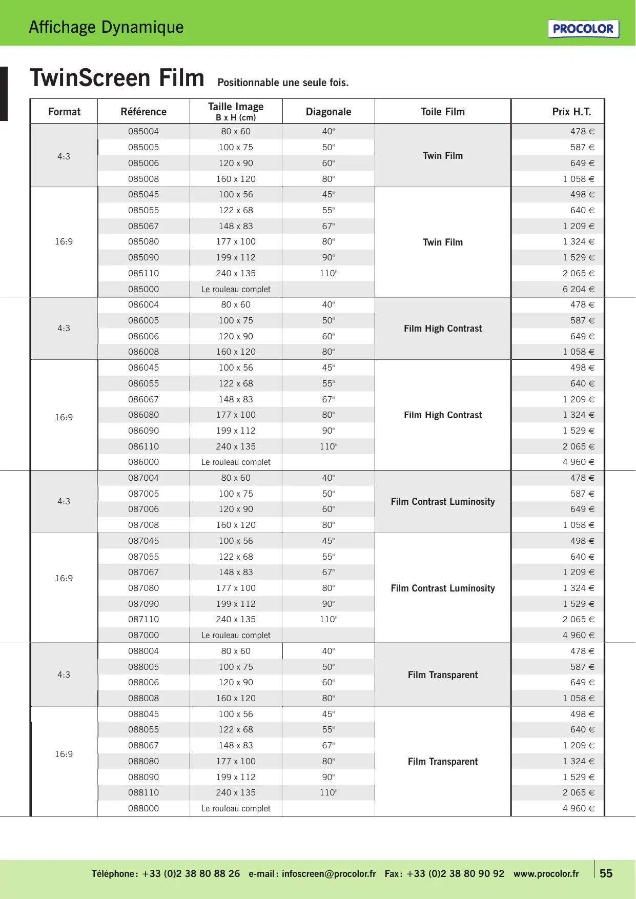 | 16:9 | 086045 | 100 x 56 | 45" | Film High Contrast | 498 € |