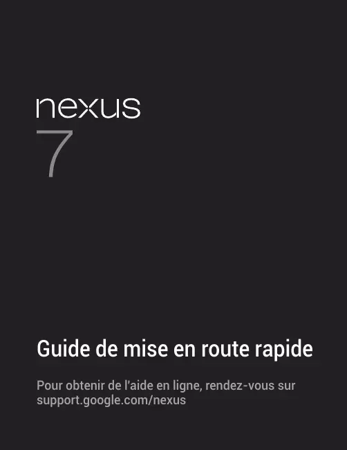 Guide de mise en route rapide Pour obtenir de l'aide en ligne, rendez-vous sur support.google.com/nexus Informations sur les droits de propriété intellectuelle Copyright © 2012 ASUSTek COMPUTER INC. Tous droits réservés. Aucune partie de ce guide, y compris les produits et les logiciels qui y sont d écrits, ne peut être reproduite, transmise, transcrite, stockée dans un système de base de données ni traduite dans aucune langue, sous quelque forme et par quelque moyen que ce soit, hormis la documentation conservée par l'acheteur à des fins de sauvegarde, sans la permission expresse écrite de ASUSTek COMPUTER INC. ("ASUS"). Cette clause ne s'applique pas aux logiciels cédés sous licence aux termes de la licence publique générale (General Public License ou "GPL") ou de toutes autres licences Open Source gratuites. Des copies des conditions de licence respectives et, le cas échéant, une offre concernant la fourniture du code source correspondant, sont incluses dans ce produit. Google, Android, Gmail, Google Maps, Nexus 7, Google Play, You Tube, Google+ et les autres marques mentionnées dans ce guide sont la propriété de Google Inc. ASUS et le logo ASUS sont des marques de ASUSTek Computer Inc. Toutes les autres marques sont la propriété de leurs détenteurs respectifs. Certains détails concernant les informations contenues dans ce guide peuvent différer de celles de votre appareil ou de son logiciel. De même, elles sont susceptibles d'être modifiées sans préavis. La tablette Nexus 7 est certifiée par ASUS sous le nom ASUS Pad ME370T. Pour obtenir de l'aide en ligne, rendez-vous sur support.google.com/nexus. Éléments fournis Câble micro USB Nexus 7 chargeur USB Warranty Guide de mise en route rapide Garantie