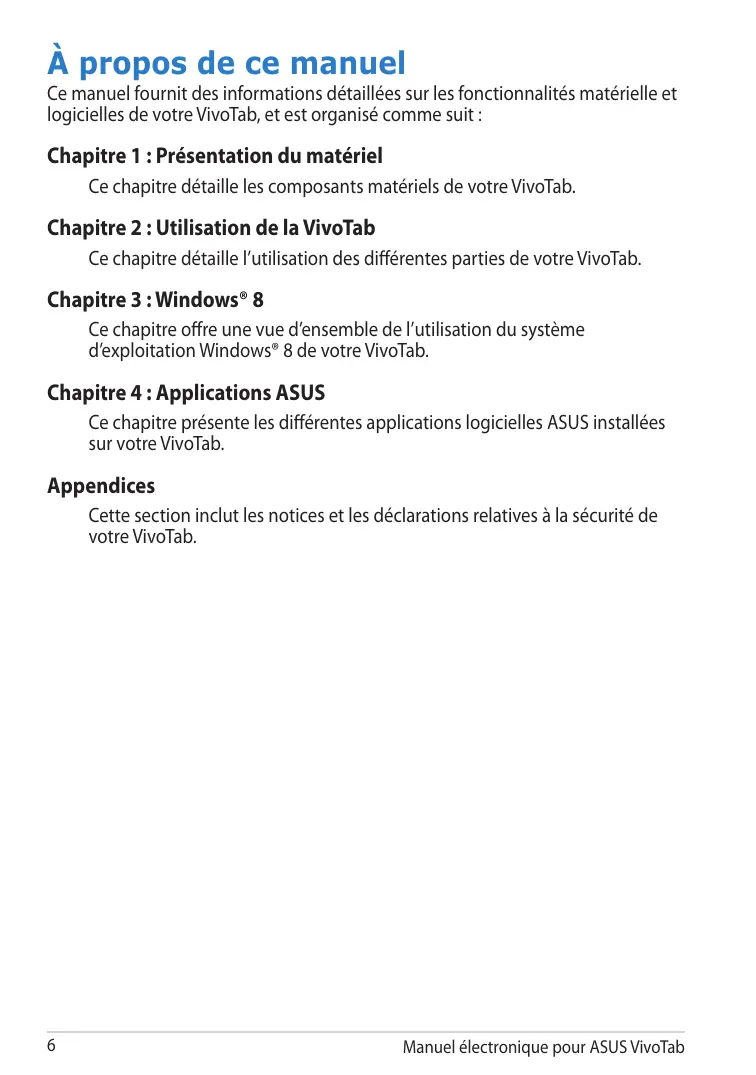 À propos de ce manuel Ce manuel fournit des informations détaillées sur les fonctionnalités matérielle et logicielles de votre VivoTab, et est organisé comme suit :