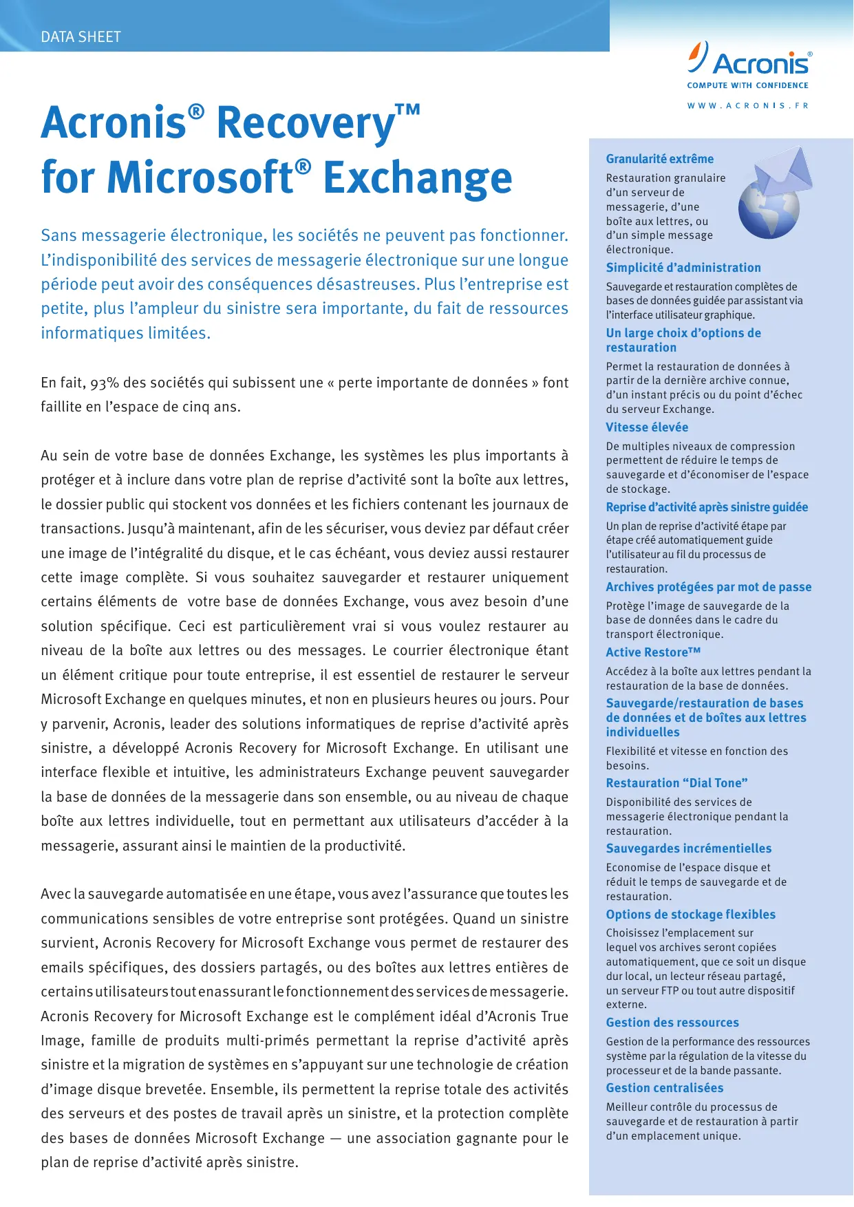 Sans messagerie électronique, les sociétés ne peuvent pas fonctionner. L’indisponibilité des services de messagerie électronique sur une longue période peut avoir des conséquences désastreuses. Plus l’entreprise est petite, plus l’ampleur du sinistre sera importante, du fait de ressources informatiques limitées. En fait, 93% des sociétés qui subissent une « perte importante de données » font faillite en l’espace de cinq ans. Granularité extrême Restauration granulaire d’un serveur de messagerie, d’une boîte aux lettres, ou d’un simple message électronique. Simplicité d’administration Sauvegarde et restauration complètes de bases de données guidée par assistant via l’interface utilisateur graphique. Un large choix d’options de restauration Permet la restauration de données à partir de la dernière archive connue, d’un instant précis ou du point d’échec du serveur Exchange. Vitesse élevée Au sein de votre base de données Exchange, les systèmes les plus importants à protéger et à inclure dans votre plan de reprise d’activité sont la boîte aux lettres, le dossier public qui stockent vos données et les fichiers contenant les journaux de transactions. Jusqu’à maintenant, afin de les sécuriser, vous deviez par défaut créer une image de l’intégralité du disque, et le cas échéant, vous deviez aussi restaurer cette image complète. Si vous souhaitez sauvegarder et restaurer uniquement certains éléments de votre base de données Exchange, vous avez besoin d’une solution spécifique. Ceci est particulièrement vrai si vous voulez restaurer au niveau de la boîte aux lettres ou des messages. Le courrier électronique étant un élément critique pour toute entreprise, il est essentiel de restaurer le serveur Microsoft Exchange en quelques minutes, et non en plusieurs heures ou jours. Pour y parvenir, Acronis, leader des solutions informatiques de reprise d’activité après sinistre, a développé Acronis Recovery for Microsoft Exchange. En utilisant une interface flexible et intuitive, les administrateurs Exchange peuvent sauvegarder la base de données de la messagerie dans son ensemble, ou au niveau de chaque boîte aux lettres individuelle, tout en permettant aux utilisateurs d’accéder à la messagerie, assurant ainsi le maintien de la productivité. Avec la sauvegarde automatisée en une étape, vous avez l’assurance que toutes les communications sensibles de votre entreprise sont protégées. Quand un sinistre survient, Acronis Recovery for Microsoft Exchange vous permet de restaurer des emails spécifiques, des dossiers partagés, ou des boîtes aux lettres entières de certains utilisateurs tout enassurant le fonctionnement des services de messagerie. Acronis Recovery for Microsoft Exchange est le complément idéal d’Acronis True Image, famille de produits multi-primés permettant la reprise d’activité après De multiples niveaux de compression permettent de réduire le temps de sauvegarde et d’économiser de l’espace de stockage. Reprise d’activité après sinistre guidée Un plan de reprise d’activité étape par étape créé automatiquement guide l’utilisateur au fil du processus de restauration. Archives protégées par mot de passe Protège l’image de sauvegarde de la base de données dans le cadre du transport électronique. Active Restore™ Accédez à la boîte aux lettres pendant la restauration de la base de données. Sauvegarde/restauration de bases de données et de boîtes aux lettres individuelles Flexibilité et vitesse en fonction des besoins. Restauration “Dial Tone” Disponibilité des services de messagerie électronique pendant la restauration. Sauvegardes incrémentielles Economise de l’espace disque et réduit le temps de sauvegarde et de restauration. Options de stockage flexibles Choisissez l’emplacement sur lequel vos archives seront copiées automatiquement, que ce soit un disque dur local, un lecteur réseau partagé, un serveur FTP ou tout autre dispositif externe. Gestion des ressources sinistre et la migration de systèmes en s’appuyant sur une technologie de création Gestion de la performance des ressources système par la régulation de la vitesse du processeur et de la bande passante. d’image disque brevetée. Ensemble, ils permettent la reprise totale des activités Gestion centralisées des serveurs et des postes de travail après un sinistre, et la protection complète Meilleur contrôle du processus de sauvegarde et de restauration à partir d’un emplacement unique. des bases de données Microsoft Exchange — une association gagnante pour le plan de reprise d’activité après sinistre. DATA SHEET Fonctionnalités Emplacements de sauvegarde Bandes Acronis True Image Echo Backup Server Lecteurs réseau partagés Serveur FTP Types de sauvegarde Base de données – Complète Base de données – Différentielle Base de données – Incrémentielle Boîte aux lettres – Complète Boîte aux lettres – Incrémentielle Fonctionnalités de sauvegarde Sauvegarde de la base de données et de boîtes aux lettres individuelles Sauvegarde de toute la banque d’informations (ensemble de groupes de stockage) Sauvegarde de groupes de stockage isolés Sauvegarde de boîtes aux lettres/dossiers ou sous-dossiers publics Filtrage durant la sauvegarde de boîtes aux lettres individuelles Utilisation de l’Assistant de Sauvegarde Acronis pour créer un schéma de tâches Protection quasi continue des données par la sauvegarde des journaux de transactions Exchange Fonctionnalités de restauration Restauration de boîtes aux lettres ou d’emails isolés par la sauvegarde de base de données ou de boîtes aux lettres individuelles Recherche d’un seul message électronique à restaurer Restauration de groupes de stockage Restauration au point d'échec Restauration de données guidée par assistant Gestion intelligente des journaux de transactions Exchang
