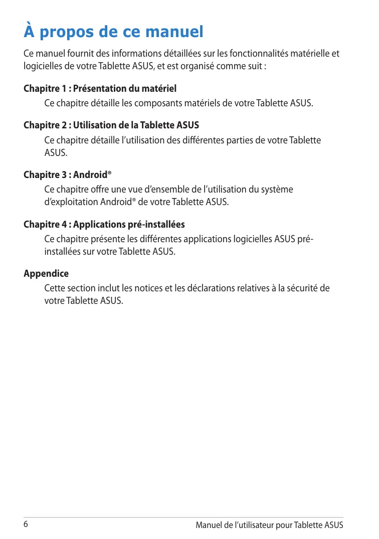 À propos de ce manuel Ce manuel fournit des informations détaillées sur les fonctionnalités matérielle et logicielles de votre Tablette ASUS, et est organisé comme suit :