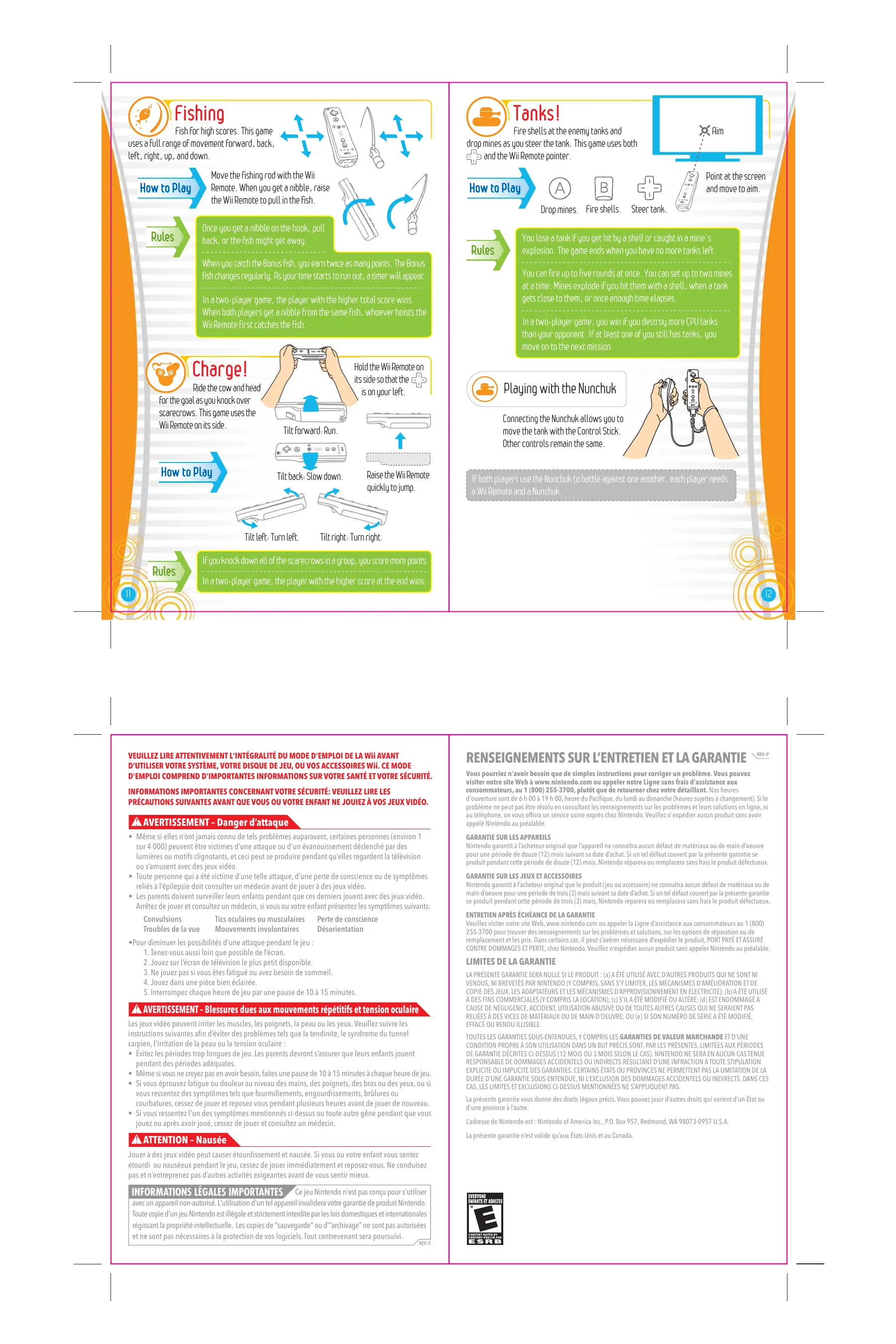 - Si vous ressentez l'un des symptômes mentionnés ci-dessus ou toute autre gêne pendant que vous jouez ou après avoir joué, cessez de jouer et consultez un médecin. LA PRÉSENTE GARANTIE SERA NULLE SI LE PRODUIT : (a) A ÉTÉ UTILISÉ AVEC D’AUTRES PRODUITS QUI NE SONT NI VENDUS, NI BREVETÉS PAR NINTENDO (Y COMPRIS, SANS S’Y LIMITER, LES MÉCANISMES D’AMÉLIORATION ET DE COPIE DES JEUX, LES ADAPTATEURS ET LES MÉCANISMES D’APPROVISIONNEMENT EN ÉLECTRICITÉ); (b) A ÉTÉ UTILISÉ À DES FINS COMMERCIALES (Y COMPRIS LA LOCATION); (c) S’IL A ÉTÉ MODIFIÉ OU ALTÉRÉ; (d) EST ENDOMMAGÉ À CAUSE DE NÉGLIGENCE, ACCIDENT, UTILISATION ABUSIVE OU DE TOUTES AUTRES CAUSES QUI NE SERAIENT PAS RELIÉES À DES VICES DE MATÉRIAUX OU DE MAIN-D’OEUVRE; OU (e) SI SON NUMÉRO DE SÉRIE A ÉTÉ MODIFIÉ, EFFACÉ OU RENDU ILLISIBLE. TOUTES LES GARANTIES SOUS-ENTENDUES, Y COMPRIS LES GARANTIES DE VALEUR MARCHANDE ET D’UNE CONDITION PROPRE À SON UTILISATION DANS UN BUT PRÉCIS SONT, PAR LES PRÉSENTES, LIMITÉES AUX PÉRIODES DE GARANTIE DÉCRITES CI-DESSUS (12 MOIS OU 3 MOIS SELON LE CAS). NINTENDO NE SERA EN AUCUN CAS TENUE RESPONSABLE DE DOMMAGES ACCIDENTELS OU INDIRECTS RÉSULTANT D’UNE INFRACTION À TOUTE STIPULATION EXPLICITE OU IMPLICITE DES GARANTIES. CERTAINS ÉTATS OU PROVINCES NE PERMETTENT PAS LA LIMITATION DE LA DURÉE D’UNE GARANTIE SOUS-ENTENDUE, NI L’EXCLUSION DES DOMMAGES ACCIDENTELS OU INDIRECTS. DANS CES CAS, LES LIMITES ET EXCLUSIONS CI-DESSUS MENTIONNÉES NE S’APPLIQUENT PAS. La présente garantie vous donne des droits légaux précis. Vous pouvez jouir d’autres droits qui varient d’un État ou d’une province à l’autre. L’adresse de Nintendo est : Nintendo of America Inc., P.O. Box 957, Redmond, WA 98073-0957 U.S.A. La présente garantie n’est valide qu’aux États-Unis et au Canada. ATTENTION – Nausée Jouer à des jeux vidéo peut causer étourdissement et nausée. Si vous ou votre enfant vous sentez étourdi ou nauséeux pendant le jeu, cessez de jouer immédiatement et reposez-vous. Ne conduisez pas et n’entreprenez pas d’autres activités exigeantes avant de vous sentir mieux. Ce jeu Nintendo n'est pas conçu pour s'utiliser avec un appareil non-autorisé. L'utilisation d'un tel appareil invalidera votre garantie de produit Nintendo. Toute copie d'un jeu Nintendo est illégale et strictement interdite par les lois domestiques et internationales régissant la propriété intellectuelle. Les copies de “sauvegarde” ou d'“archivage” ne sont pas autorisées et ne sont pas nécessaires à la protection de vos logiciels. Tout contrevenant sera poursuivi. REV–E Bouton d'alimentation Contrôles Bouger Retourner à l'écran précédent Confirmer Ouvrir/fermer le menu HOME Voir pages 19-23 pour les contrôles de chaque jeu Ouvrir/fermer le menu de pause Tenir la Télécommande Wii Sur l'écran d'Aperçu des Chaînes, pointez sur Start et appuyez sur