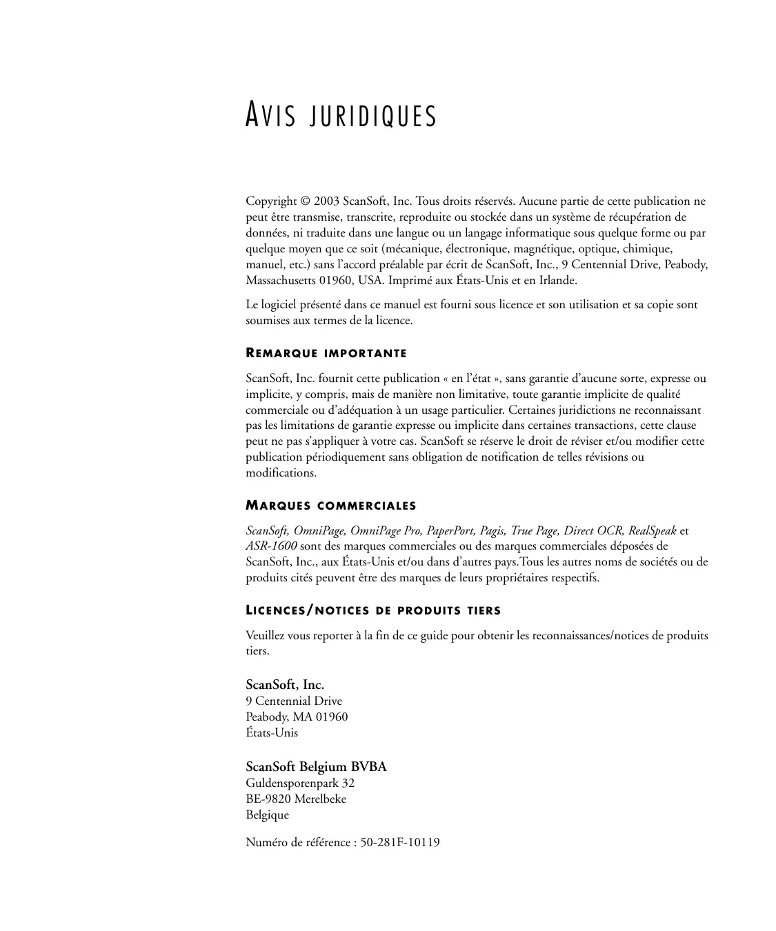 Veuillez vous reporter à la fin de ce guide pour obtenir les reconnaissances/notices de produits tiers. ScanSoft, Inc. 9 Centennial Drive Peabody, MA 01960 États-Unis ScanSoft Belgium BVBA Guldensporenpark 32 BE-9820 Merelbeke Belgique Numéro de référence : 50-281F-10119