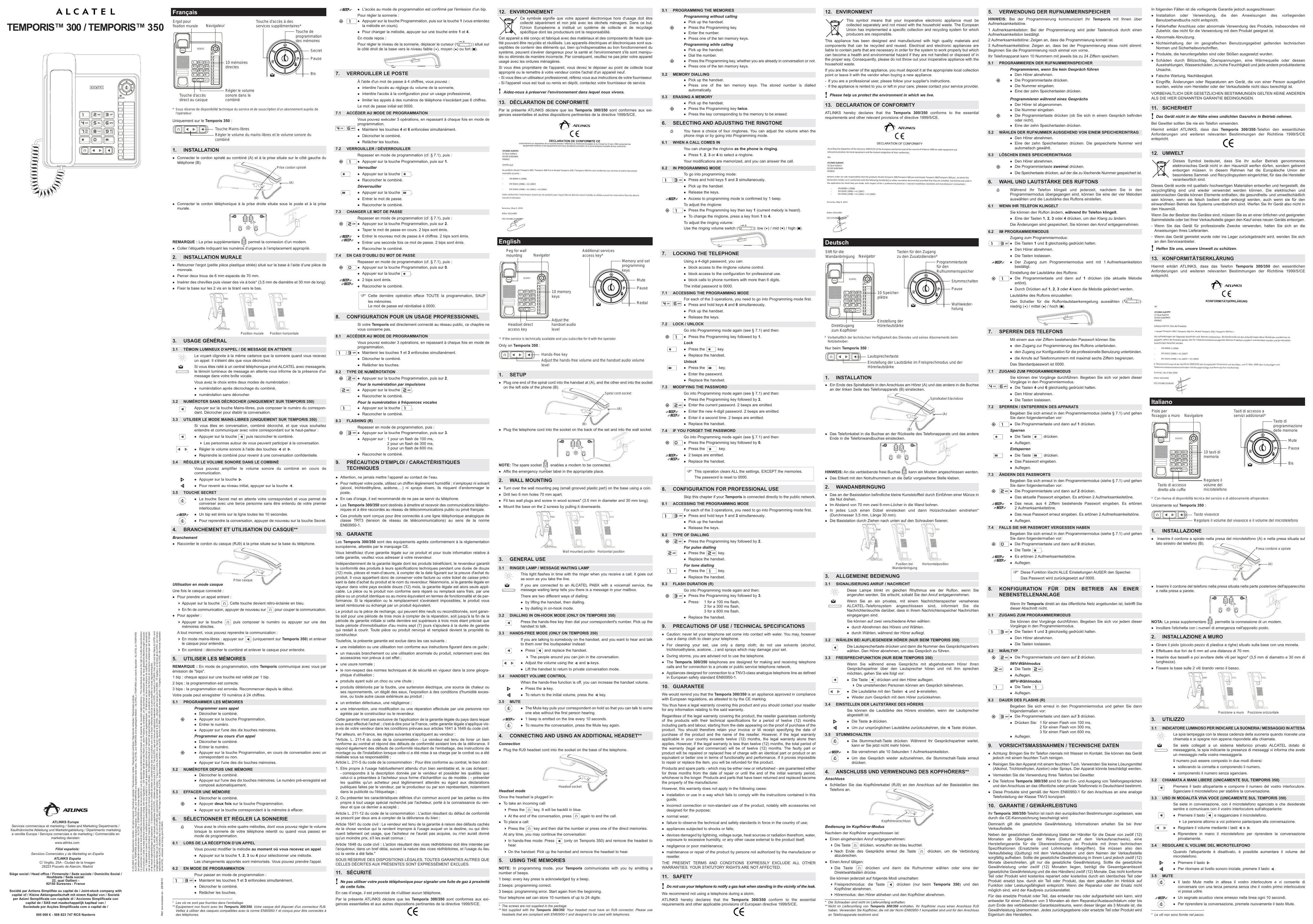 EINSTELLEN DER LAUTSTÄRKE DES HÖRERS Die Taste Par la présente ATLINKS déclare que les Temporis 300/350 sont conformes aux exigences essentielles et aux autres dispositions pertinentes de la directive 1999/5/CE.