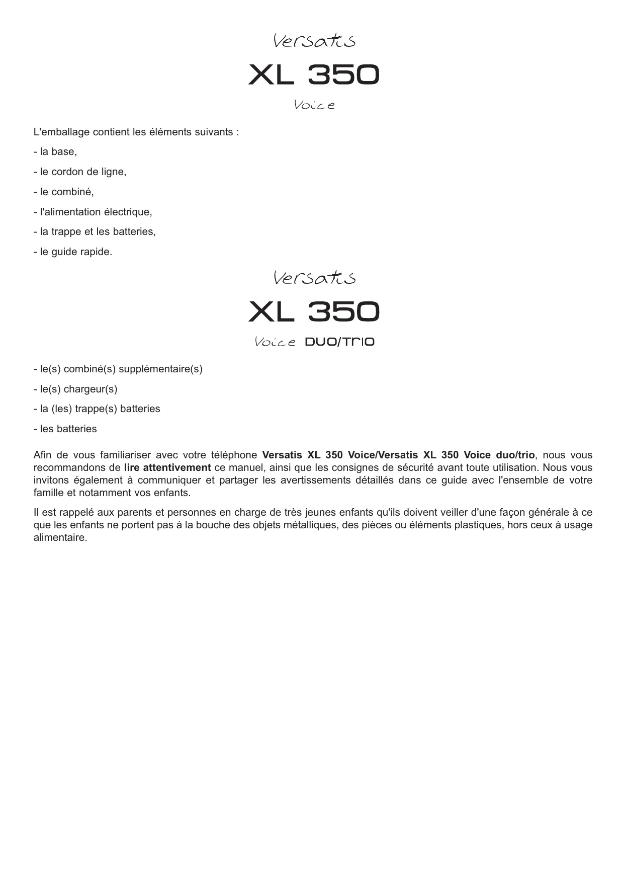 Guide d'utilisation L'emballage contient les éléments suivants : - la base, - le cordon de ligne, - le combiné, - l'alimentation électrique, - la trappe et les batteries, - le guide rapide. - le(s) combiné(s) supplémentaire(s) - le(s) chargeur(s) - la (les) trappe(s) batteries - les batteries Afin de vous familiariser avec votre téléphone Versatis XL 350 Voice/Versatis XL 350 Voice duo/trio, nous vous recommandons de lire attentivement ce manuel, ainsi que les consignes de sécurité avant toute utilisation. Nous vous invitons également à communiquer et partager les avertissements détaillés dans ce guide avec l'ensemble de votre famille et notamment vos enfants. Il est rappelé aux parents et personnes en charge de très jeunes enfants qu'ils doivent veiller d'une façon générale à ce que les enfants ne portent pas à la bouche des objets métalliques, des pièces ou éléments plastiques, hors ceux à usage alimentaire. - Aller au message précédent lors de l'annonce du message - Répéter le message pendant son écoute Marche/arrêt du répondeur Touche recherche Arrêt de Compteur de combiné la lecture de message Lecture - Appui vers le bas : diminuer le volume sonore de l'écouteur, du mains-libres et de la sonnerie - Appui vers le haut : augmenter le volume sonore de l'écouteur, du mains-libres et de la sonnerie Lors d'un appel : - Appui vers le haut : accès à la liste des appels reçus* - Appui vers le bas : accès à la liste des numéros composés En veille : Dans le menu : navigation Navigateur