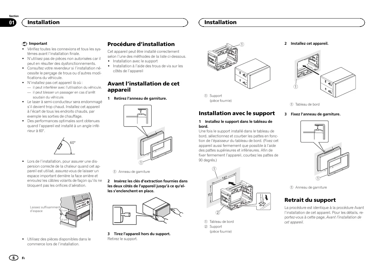 Important ! Vérifiez toutes les connexions et tous les systèmes avant l’installation finale. ! N’utilisez pas de pièces non autorisées car il peut en résulter des dysfonctionnements. ! Consultez votre revendeur si l’installation nécessite le perçage de trous ou d’autres modifications du véhicule. ! N’installez pas cet appareil là où : — il peut interférer avec l’utilisation du véhicule. — il peut blesser un passager en cas d’arrêt soudain du véhicule.