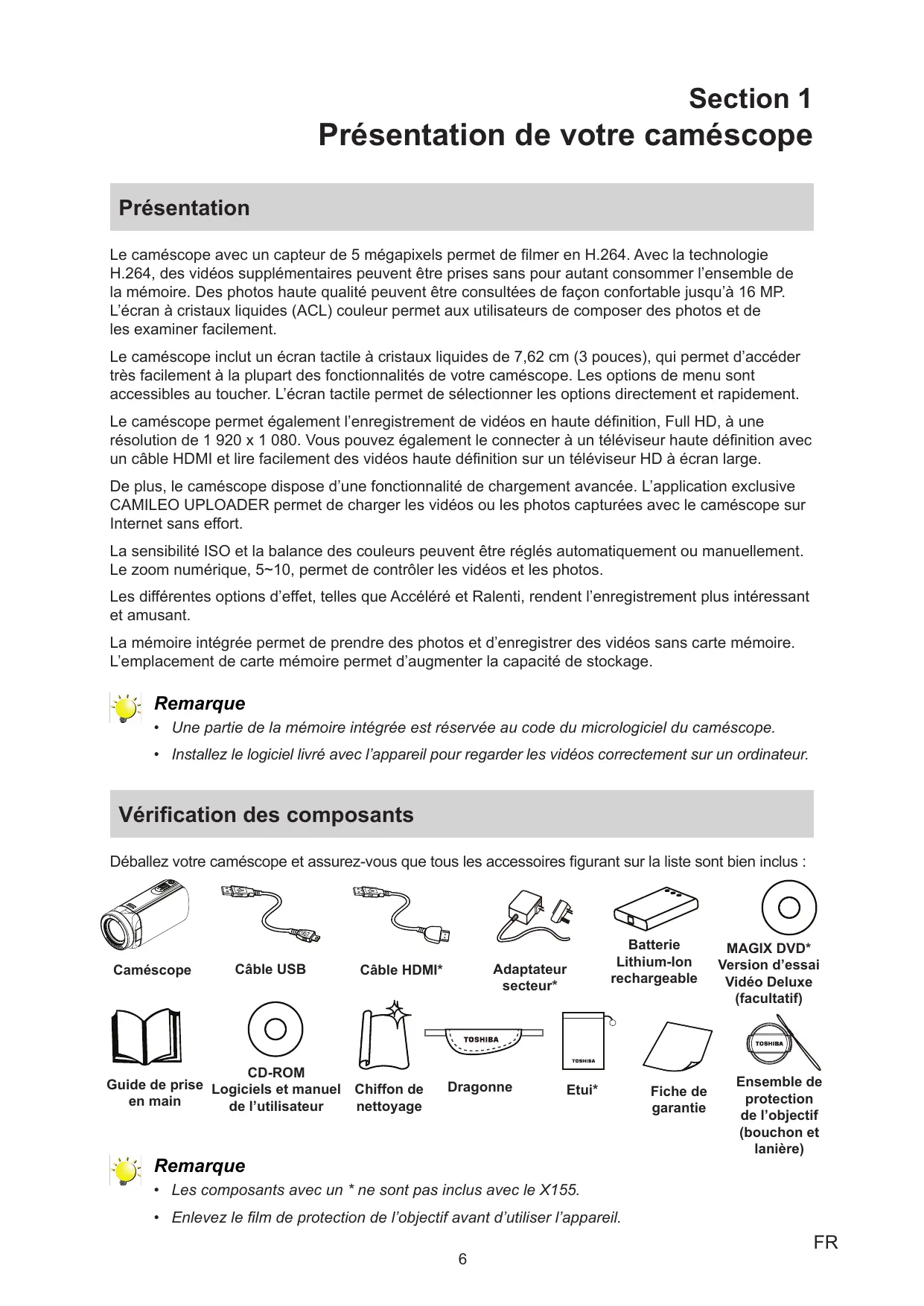 - Installez le logiciel livré avec l’appareil pour regarder les vidéos correctement sur un ordinateur. Vérification des composants Déballez votre caméscope et assurez-vous que tous les accessoires figurant sur la liste sont bien inclus : Caméscope Câble USB Adaptateur secteur* Câble HDMI* CD-ROM Guide de prise Logiciels et manuel Chiffon de en main nettoyage de l’utilisateur Dragonne Batterie Lithium-Ion rechargeable Etui* Remarque Fiche de garantie MAGIX DVD* Version d’essai Vidéo Deluxe (facultatif) Ensemble de protection de l’objectif (bouchon et lanière)