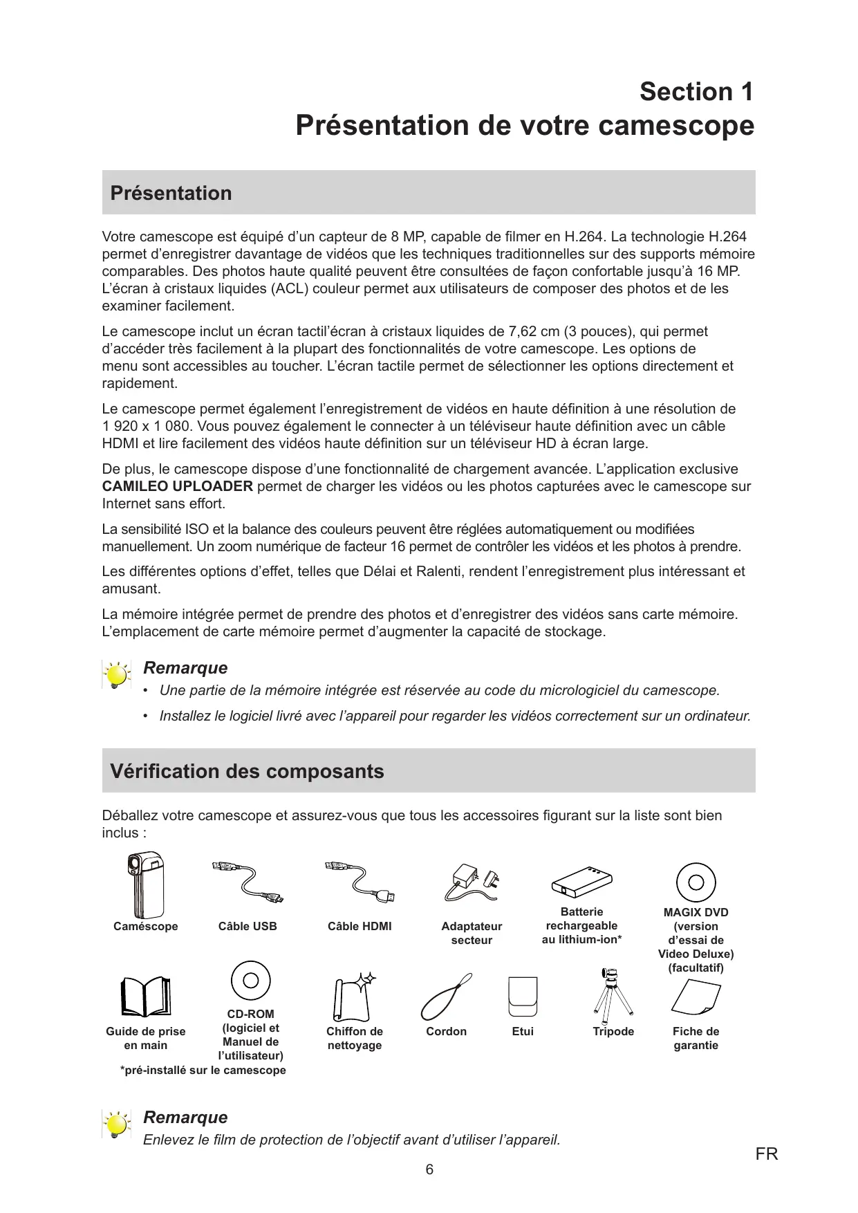 Votre camescope est équipé d’un capteur de 8 MP, capable de filmer en H.264. La technologie H.264 permet d’enregistrer davantage de vidéos que les techniques traditionnelles sur des supports mémoire comparables. Des photos haute qualité peuvent être consultées de façon confortable jusqu’à 16 MP. L’écran à cristaux liquides (ACL) couleur permet aux utilisateurs de composer des photos et de les examiner facilement. Le camescope inclut un écran tactil’écran à cristaux liquides de 7,62 cm (3 pouces), qui permet d’accéder très facilement à la plupart des fonctionnalités de votre camescope. Les options de menu sont accessibles au toucher. L’écran tactile permet de sélectionner les options directement et rapidement. Le camescope permet également l’enregistrement de vidéos en haute définition à une résolution de 1 920 x 1 080. Vous pouvez également le connecter à un téléviseur haute définition avec un câble HDMI et lire facilement des vidéos haute définition sur un téléviseur HD à écran large. De plus, le camescope dispose d’une fonctionnalité de chargement avancée. L’application exclusive CAMILEO UPLOADER permet de charger les vidéos ou les photos capturées avec le camescope sur Internet sans effort. La sensibilité ISO et la balance des couleurs peuvent être réglées automatiquement ou modifiées manuellement. Un zoom numérique de facteur 16 permet de contrôler les vidéos et les photos à prendre. Les différentes options d’effet, telles que Délai et Ralenti, rendent l’enregistrement plus intéressant et amusant. La mémoire intégrée permet de prendre des photos et d’enregistrer des vidéos sans carte mémoire. L’emplacement de carte mémoire permet d’augmenter la capacité de stockage.