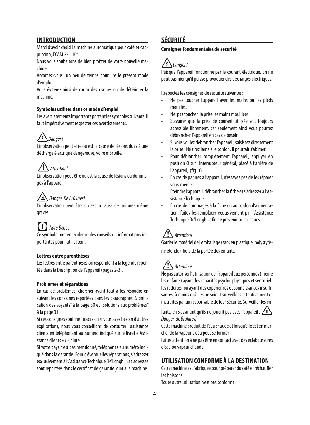 - En cas de dommages à la fiche ou au cordon d’alimentation, faites-les remplacer exclusivement par l’Assistance Technique De’Longhi, afin de prévenir tous risques. Symboles utilisés dans ce mode d’emploi Les avertissements importants portent les symboles suivants. Il faut impérativement respecter ces avertissements. Danger ! L’inobservation peut être ou est la cause de lésions dues à une décharge électrique dangereuse, voire mortelle. Attention! L’inobservation peut être ou est la cause de lésions ou dommages à l’appareil. Danger De Brûlures! L’inobservation peut être ou est la cause de brûlures même graves. Nota Bene : Ce symbole met en évidence des conseils ou informations importantes pour l’utilisateur. Attention! Garder le matériel de l’emballage (sacs en plastique, polystyrène étendu) hors de la portée des enfants. Lettres entre parenthèses Les lettres entre parenthèses correspondent à la légende reportée dans la Description de l’appareil (pages 2-3). Attention! Ne pas autoriser l’utilisation de l’appareil aux personnes (même les enfants) ayant des capacités psycho-physiques et sensorielles réduites, ou ayant des expériences et connaissances insuffisantes, à moins qu’elles ne soient surveillées attentivement et instruites par un responsable de leur sécurité. Surveiller les en- Problèmes et réparations En cas de problèmes, chercher avant tout à les résoudre en suivant les consignes reportées dans les paragraphes “Signification des voyants” à la page 30 et “Solutions aux problèmes” à la page 31. Si ces consignes sont inefficaces ou si vous avez besoin d’autres explications, nous vous conseillons de consulter l’assistance clients en téléphonant au numéro indiqué sur le livret « Assistance clients » ci-jointe. Si votre pays n’est pas mentionné, téléphonez au numéro indiqué dans la garantie. Pour d’éventuelles réparations, s’adresser exclusivement à l’Assistance Technique De’Longhi. Les adresses sont reportées dans le certificat de garantie joint à la machine. fants, en s’assurant qu’ils ne jouent pas avec l’appareil . Danger de Brûlures! Cette machine produit de l’eau chaude et lorsqu’elle est en marche, de la vapeur d’eau peut se former. Faites attention à ne pas être en contact avec des éclaboussures d’eau ou vapeur chaude.