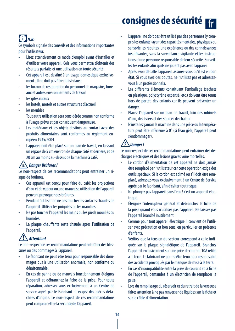- Cet appareil est conçu pour faire du café: les projections d’eau et de vapeur ou une mauvaise utilisation de l’appareil peuvent provoquer des brûlures.
