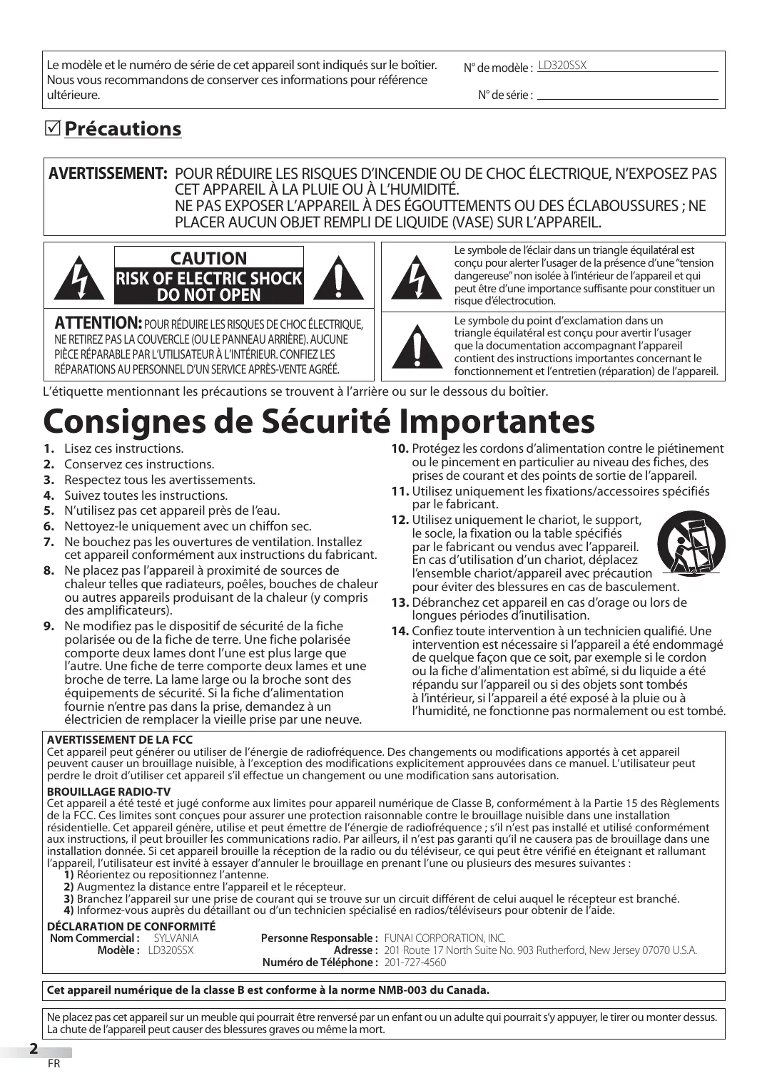 Nom Commercial : SYLVANIA Personne Responsable : FUNAI CORPORATION, INC. Modèle : LD320SSX Adresse : 201 Route 17 North Suite No. 903 Rutherford, New Jersey 07070 U.S.A. Numéro de Téléphone : 201-727-4560 Cet appareil numérique de la classe B est conforme à la norme NMB-003 du Canada. Ne placez pas cet appareil sur un meuble qui pourrait être renversé par un enfant ou un adulte qui pourrait s’y appuyer, le tirer ou monter dessus. La chute de l’appareil peut causer des blessures graves ou même la mort.