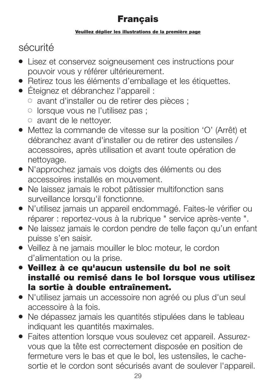 Lisez et conservez soigneusement ces instructions pour pouvoir vous y référer ultérieurement. Retirez tous les éléments d’emballage et les étiquettes. Éteignez et débranchez l'appareil : l avant d'installer ou de retirer des pièces ; l lorsque vous ne l'utilisez pas ; l avant de le nettoyer. Mettez la commande de vitesse sur la position ‘O’ (Arrêt) et débranchez avant d'installer ou de retirer des ustensiles / accessoires, après utilisation et avant toute opération de nettoyage. N'approchez jamais vos doigts des éléments ou des accessoires installés en mouvement. Ne laissez jamais le robot pâtissier multifonction sans surveillance lorsqu'il fonctionne. N’utilisez jamais un appareil endommagé. Faites-le vérifier ou réparer : reportez-vous à la rubrique " service après-vente ". Ne laissez jamais le cordon pendre de telle façon qu’un enfant puisse s’en saisir. Veillez à ne jamais mouiller le bloc moteur, le cordon d’alimentation ou la prise. Veillez à ce qu'aucun ustensile du bol ne soit installé ou remisé dans le bol lorsque vous utilisez la sortie à double entraînement. N'utilisez jamais un accessoire non agréé ou plus d'un seul accessoire à la fois. Ne dépassez jamais les quantités stipulées dans le tableau indiquant les quantités maximales. Faites attention lorsque vous soulevez cet appareil. Assurezvous que la tête est correctement disposée en position de fermeture vers le bas et que le bol, les ustensiles, le cachesortie et le cordon sont sécurisés avant de soulever l'appareil.