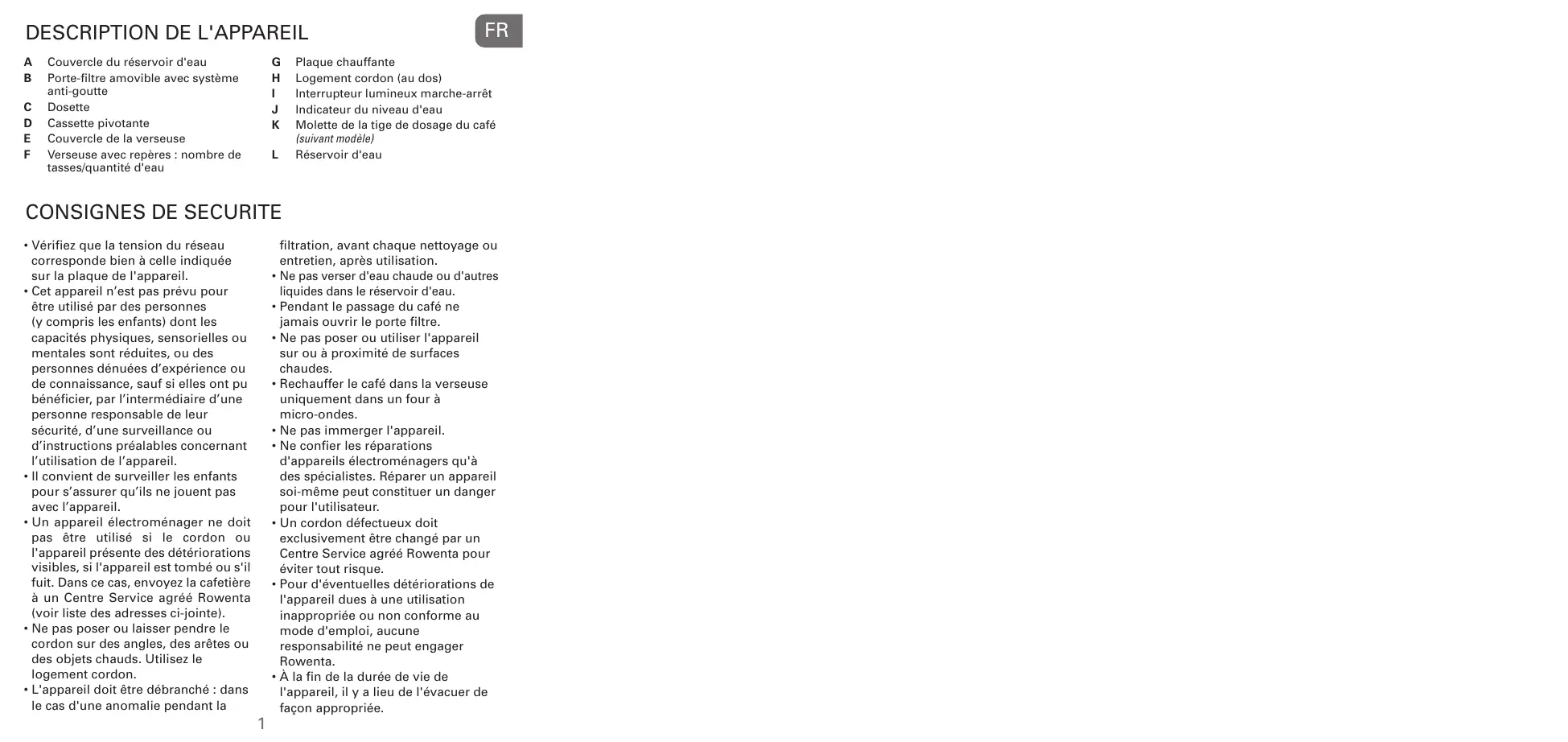 • Cet appareil n’est pas prévu pour être utilisé par des personnes (y compris les enfants) dont les capacités physiques, sensorielles ou mentales sont réduites, ou des personnes dénuées d’expérience ou de connaissance, sauf si elles ont pu bénéficier, par l’intermédiaire d’une personne responsable de leur sécurité, d’une surveillance ou d’instructions préalables concernant l’utilisation de l’appareil. • Il convient de surveiller les enfants pour s’assurer qu’ils ne jouent pas avec l’appareil. • Un appareil électroménager ne doit pas être utilisé si le cordon ou l'appareil présente des détériorations visibles, si l'appareil est tombé ou s'il fuit. Dans ce cas, envoyez la cafetière à un Centre Service agréé Rowenta (voir liste des adresses ci-jointe). • Ne pas poser ou laisser pendre le cordon sur des angles, des arêtes ou des objets chauds. Utilisez le logement cordon. • L'appareil doit être débranché : dans le cas d'une anomalie pendant la