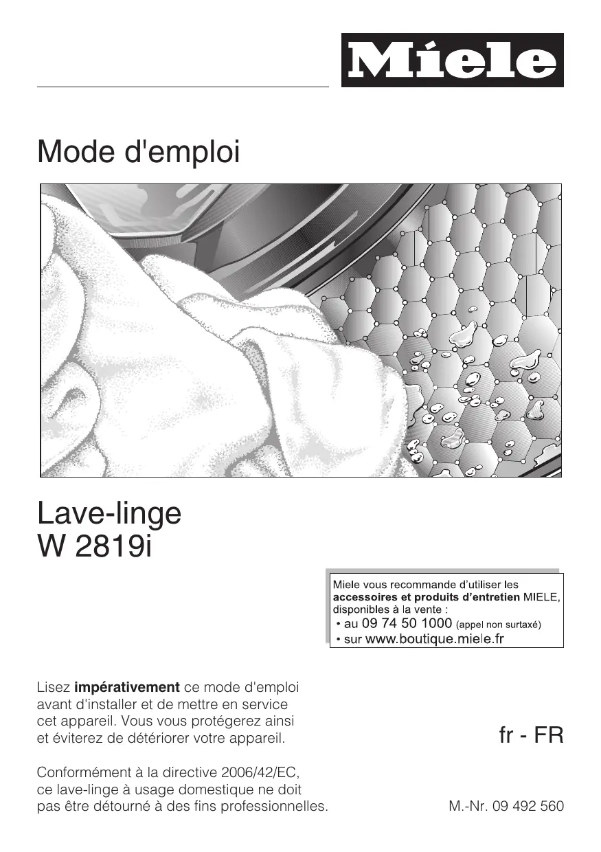 Mode d'emploi Lave-linge W 2819i Lisez impérativement ce mode d'emploi avant d'installer et de mettre en service cet appareil. Vous vous protégerez ainsi et éviterez de détériorer votre appareil. Conformément à la directive 2006/42/EC, ce lave-linge à usage domestique ne doit pas être détourné à des fins professionnelles. fr - FR M.-Nr. 09 492 560 Votre contribution à la protection de l'environnement Elimination de l'emballage L'emballage protège les lave-linge des avaries de transport. Les matériaux utilisés sont choisis en fonction de critères écologiques, de façon à en faciliter le recyclage. Le recyclage de l'emballage économise les matières premières et réduit le volume des déchets à éliminer. En principe, le revendeur reprend l'emballage à sa mise en service. Enlèvement de l'ancien appareil Les anciens appareils électriques et électroniques contiennent souvent encore des matériaux recyclables. Ils contiennent également des matériaux nocifs, nécessaires au bon fonctionnement et à la sécurité de l'appareil. Ces matériaux peuvent être dangereux pour les hommes et l'environnement s'ils restent dans la collecte de déchets ou s'ils sont mal manipulés. Ne jetez par conséquent en aucun cas votre appareil avec les déchets. Faites appel au service d'enlèvement mis en place par votre commune ou rapportez votre appareil dans un point de collecte spécialement adapté à l'évacuation de ce type d'appareils. Gardez l'ancien appareil hors de portée des enfants jusqu'à son enlèvement, pour éviter tout accident.