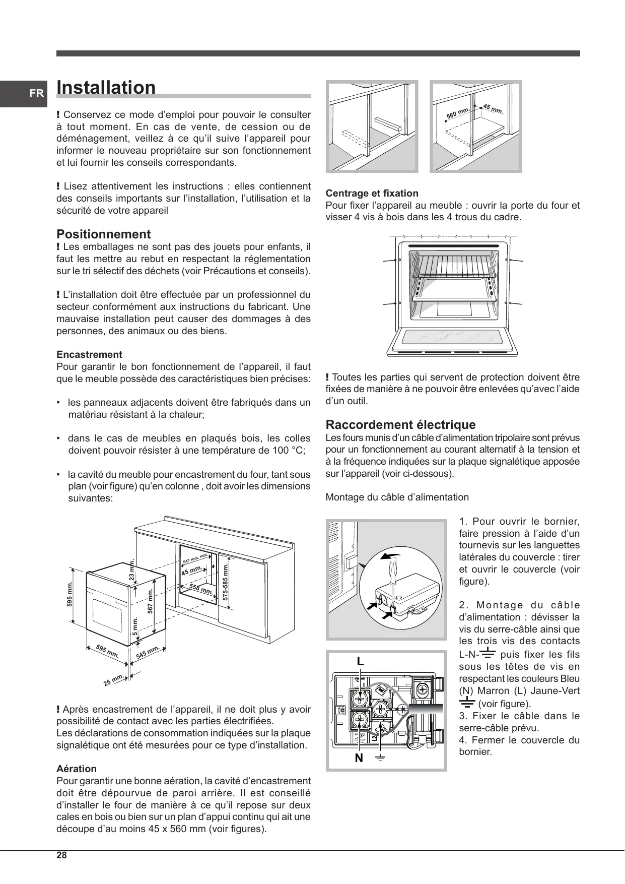 Les déclarations de consommation indiquées sur la plaque signalétique ont été mesurées pour ce type d’installation. Aération Pour garantir une bonne aération, la cavité d’encastrement doit être dépourvue de paroi arrière. Il est conseillé d’installer le four de manière à ce qu’il repose sur deux cales en bois ou bien sur un plan d’appui continu qui ait une découpe d’au moins 45 x 560 mm (voir figures). 28