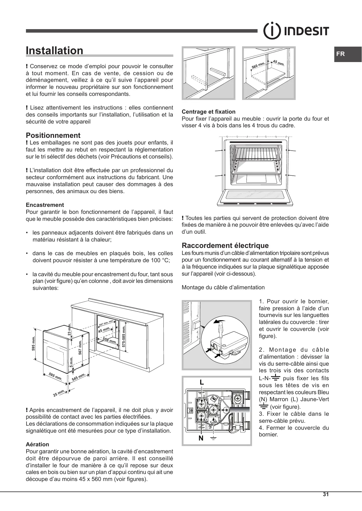 Les déclarations de consommation indiquées sur la plaque signalétique ont été mesurées pour ce type d’installation. Aération Pour garantir une bonne aération, la cavité d’encastrement doit être dépourvue de paroi arrière. Il est conseillé d’installer le four de manière à ce qu’il repose sur deux cales en bois ou bien sur un plan d’appui continu qui ait une découpe d’au moins 45 x 560 mm (voir figures).
