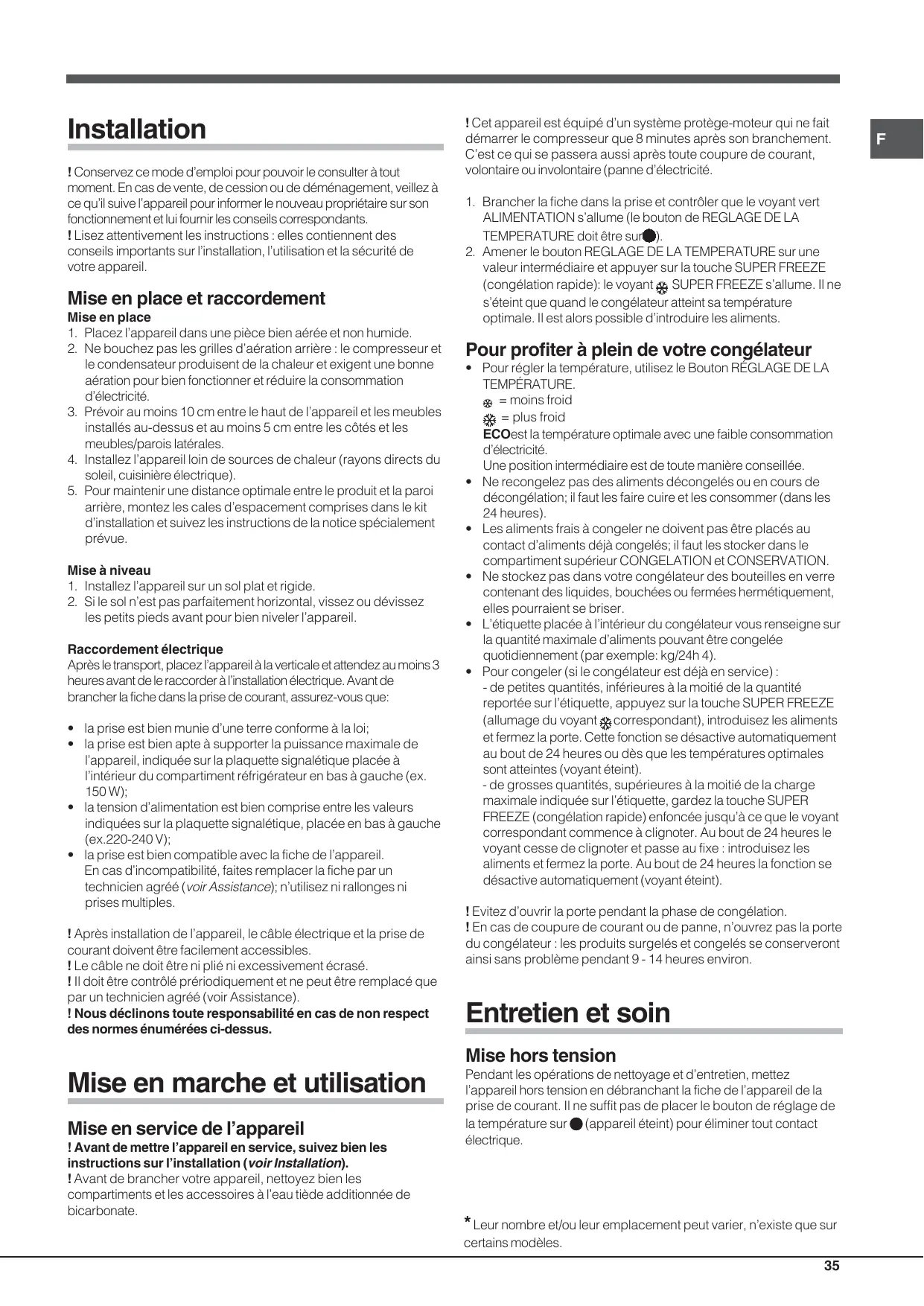 Mise en place 1. Placez l’appareil dans une pièce bien aérée et non humide. 2. Ne bouchez pas les grilles d’aération arrière : le compresseur et le condensateur produisent de la chaleur et exigent une bonne aération pour bien fonctionner et réduire la consommation d’électricité. 3. Prévoir au moins 10 cm entre le haut de l’appareil et les meubles installés au-dessus et au moins 5 cm entre les côtés et les meubles/parois latérales. 4. Installez l’appareil loin de sources de chaleur (rayons directs du soleil, cuisinière électrique). 5. Pour maintenir une distance optimale entre le produit et la paroi arrière, montez les cales d’espacement comprises dans le kit d’installation et suivez les instructions de la notice spécialement prévue. Mise à niveau 1. Installez l’appareil sur un sol plat et rigide. 2. Si le sol n’est pas parfaitement horizontal, vissez ou dévissez les petits pieds avant pour bien niveler l’appareil. Raccordement électrique Après le transport, placez l’appareil à la verticale et attendez au moins 3 heures avant de le raccorder à l’installation électrique. Avant de brancher la fiche dans la prise de courant, assurez-vous que: • la prise est bien munie d’une terre conforme à la loi; • la prise est bien apte à supporter la puissance maximale de l’appareil, indiquée sur la plaquette signalétique placée à l’intérieur du compartiment réfrigérateur en bas à gauche (ex. 150 W); • la tension d’alimentation est bien comprise entre les valeurs indiquées sur la plaquette signalétique, placée en bas à gauche (ex.220-240 V); • la prise est bien compatible avec la fiche de l’appareil. En cas d’incompatibilité, faites remplacer la fiche par un technicien agréé (voir Assistance); n’utilisez ni rallonges ni prises multiples. ! Après installation de l’appareil, le câble électrique et la prise de courant doivent être facilement accessibles. ! Le câble ne doit être ni plié ni excessivement écrasé. ! Il doit être contrôlé prériodiquement et ne peut être remplacé que par un technicien agréé (voir Assistance). ! Nous déclinons toute responsabilité en cas de non respect des normes énumérées ci-dessus.