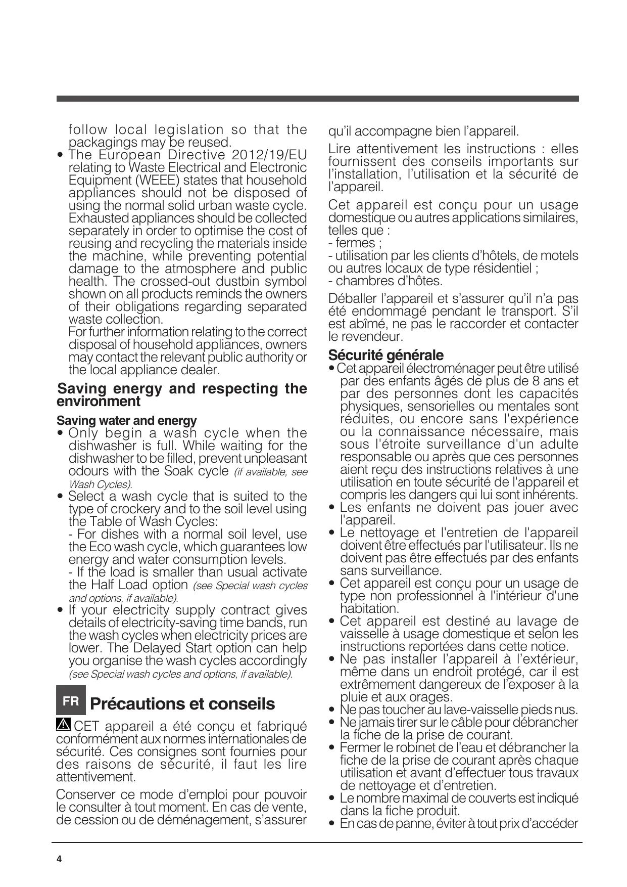 • Cet appareil électroménager peut être utilisé par des enfants âgés de plus de 8 ans et par des personnes dont les capacités physiques, sensorielles ou mentales sont réduites, ou encore sans l'expérience ou la connaissance nécessaire, mais sous l'étroite surveillance d'un adulte responsable ou après que ces personnes aient reçu des instructions relatives à une utilisation en toute sécurité de l'appareil et compris les dangers qui lui sont inhérents. • Les enfants ne doivent pas jouer avec l'appareil. • Le nettoyage et l'entretien de l'appareil doivent être effectués par l'utilisateur. Ils ne doivent pas être effectués par des enfants sans surveillance. • Cet appareil est conçu pour un usage de type non professionnel à l'intérieur d'une habitation. • Cet appareil est destiné au lavage de vaisselle à usage domestique et selon les instructions reportées dans cette notice. • Ne pas installer l’appareil à l’extérieur, même dans un endroit protégé, car il est extrêmement dangereux de l’exposer à la pluie et aux orages. • Ne pas toucher au lave-vaisselle pieds nus. • Ne jamais tirer sur le câble pour débrancher la fiche de la prise de courant. • Fermer le robinet de l’eau et débrancher la fiche de la prise de courant après chaque utilisation et avant d’effectuer tous travaux de nettoyage et d’entretien. • Le nombre maximal de couverts est indiqué dans la fiche produit. • En cas de panne, éviter à tout prix d’accéder