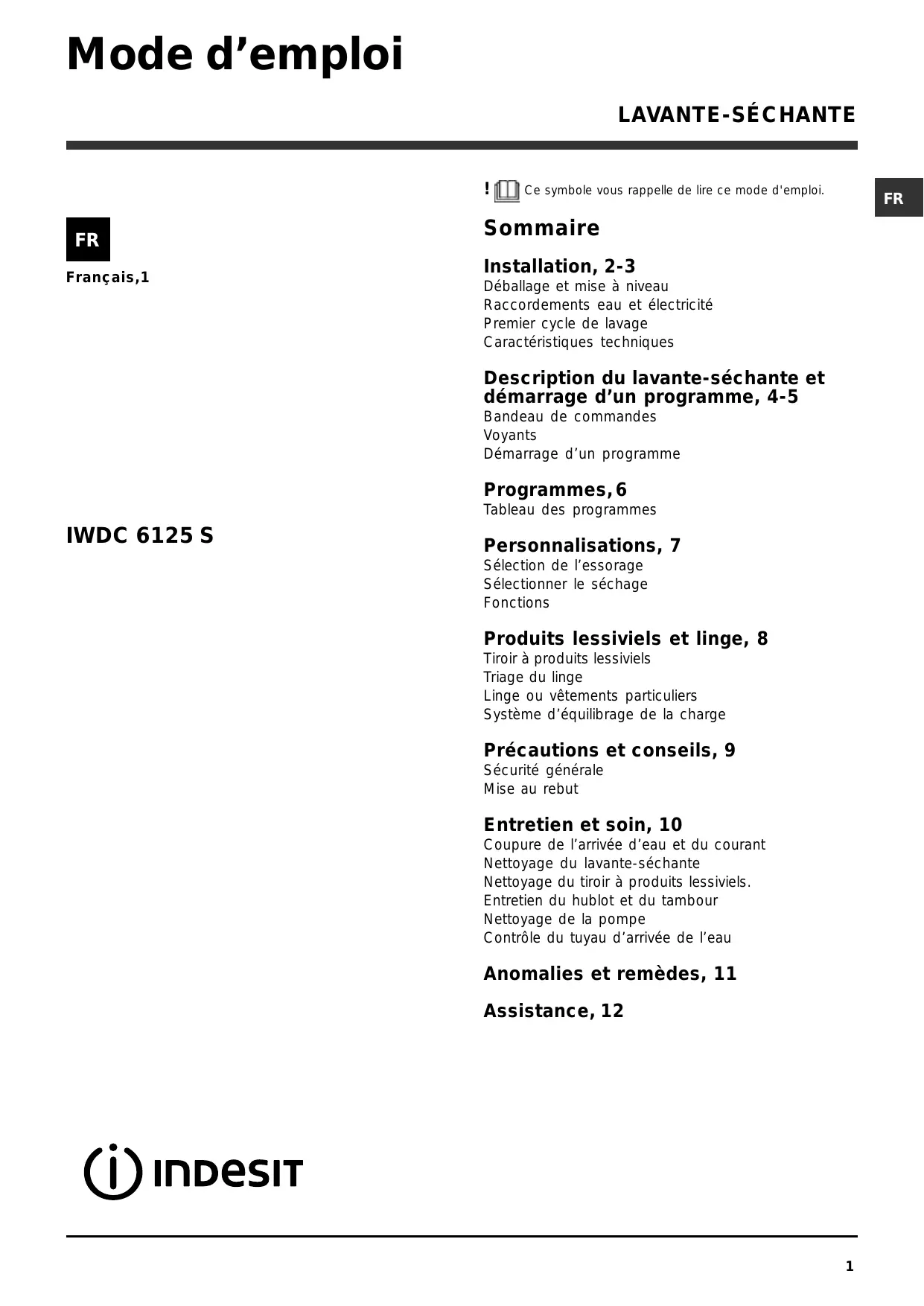 Sommaire Installation, 2-3 Déballage et mise à niveau Raccordements eau et électricité Premier cycle de lavage Caractéristiques techniques Description du lavante-séchante et démarrage d’un programme, 4-5 Bandeau de commandes Voyants Démarrage d’un programme Programmes, 6 Tableau des programmes IWDC 6125 S Personnalisations, 7 Sélection de l’essorage Sélectionner le séchage Fonctions Produits lessiviels et linge, 8 Tiroir à produits lessiviels Triage du linge Linge ou vêtements particuliers Système d’équilibrage de la charge Précautions et conseils, 9 Sécurité générale Mise au rebut Entretien et soin, 10 Coupure de l’arrivée d’eau et du courant Nettoyage du lavante-séchante Nettoyage du tiroir à produits lessiviels. Entretien du hublot et du tambour Nettoyage de la pompe Contrôle du tuyau d’arrivée de l’eau Anomalies et remèdes, 11 Assistance, 12
