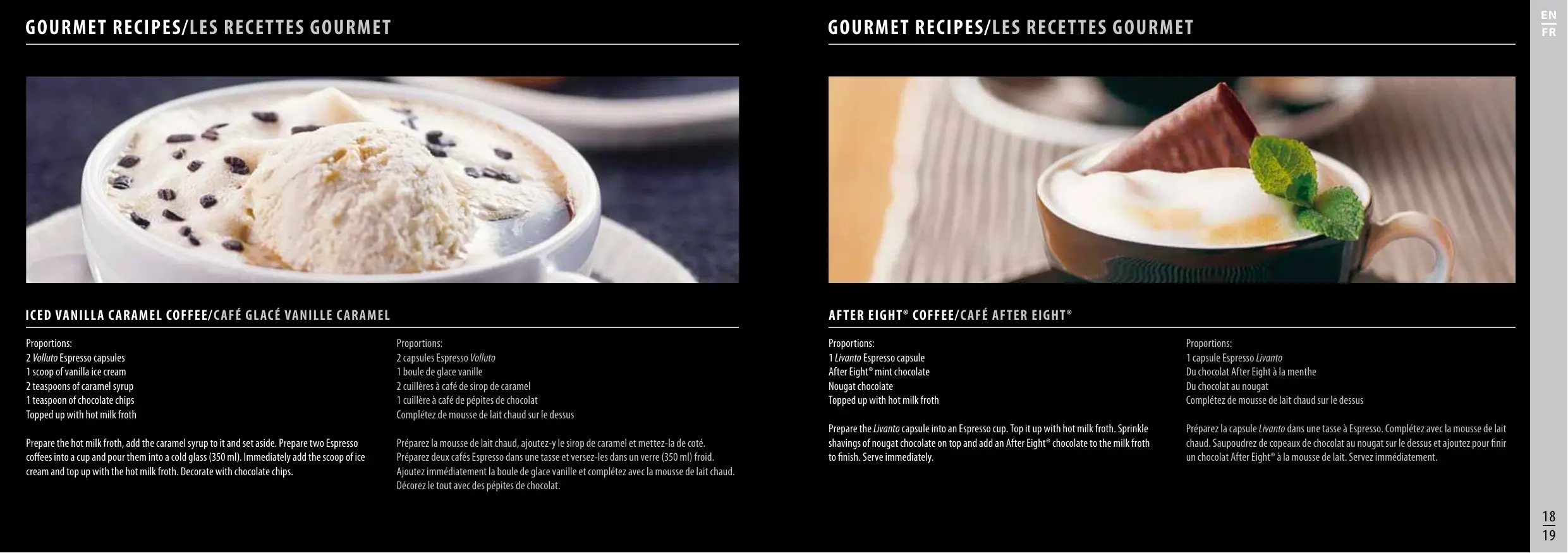 Proportions: 2 Volluto Espresso capsules 1 scoop of vanilla ice cream 2 teaspoons of caramel syrup 1 teaspoon of chocolate chips Topped up with hot milk froth Proportions: 2 capsules Espresso Volluto 1 boule de glace vanille 2 cuillères à café de sirop de caramel 1 cuillère à café de pépites de chocolat Complétez de mousse de lait chaud sur le dessus Prepare the hot milk froth, add the caramel syrup to it and set aside. Prepare two Espresso coffees into a cup and pour them into a cold glass (350 ml). Immediately add the scoop of ice cream and top up with the hot milk froth. Decorate with chocolate chips. Préparez la mousse de lait chaud, ajoutez-y le sirop de caramel et mettez-la de coté. Préparez deux cafés Espresso dans une tasse et versez-les dans un verre (350 ml) froid. Ajoutez immédiatement la boule de glace vanille et complétez avec la mousse de lait chaud. Décorez le tout avec des pépites de chocolat. Proportions: 1 Livanto Espresso capsule After Eight® mint chocolate Nougat chocolate Topped up with hot milk froth Proportions: 1 capsule Espresso Livanto Du chocolat After Eight à la menthe Du chocolat au nougat Complétez de mousse de lait chaud sur le dessus Prepare the Livanto capsule into an Espresso cup. Top it up with hot milk froth. Sprinkle shavings of nougat chocolate on top and add an After Eight® chocolate to the milk froth to finish. Serve immediately. Préparez la capsule Livanto dans une tasse à Espresso. Complétez avec la mousse de lait chaud. Saupoudrez de copeaux de chocolat au nougat sur le dessus et ajoutez pour finir un chocolat After Eight® à la mousse de lait. Servez immédiatement.
