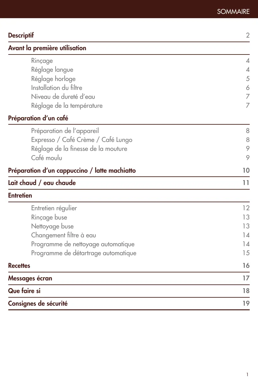 Avant la première utilisation Rinçage Réglage langue Réglage horloge Installation du filtre Niveau de dureté d’eau Réglage de la température