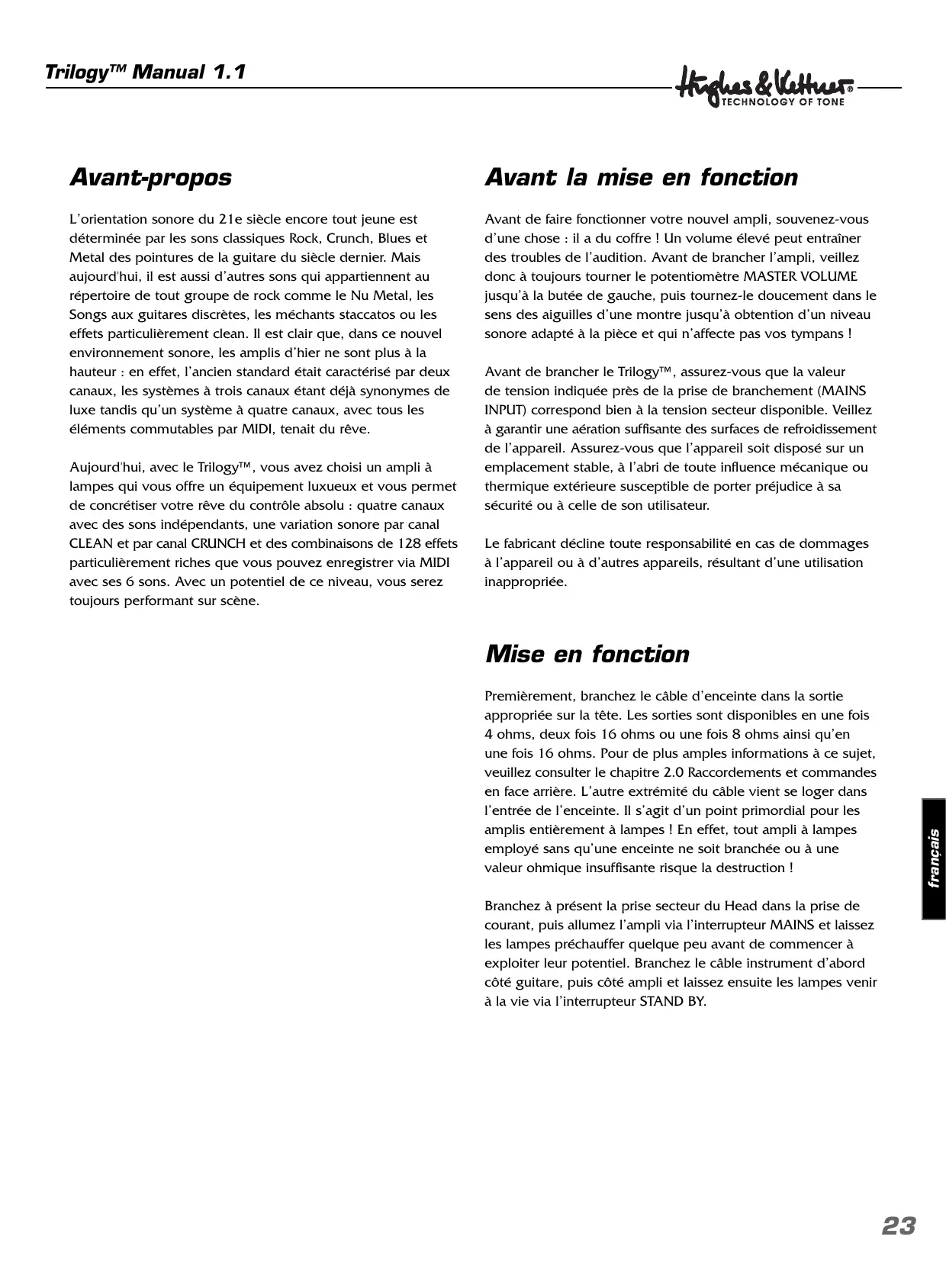 MODE D'EMPLOI HUGHES & KETTNER TRILOGY HUGHES & KETTNER