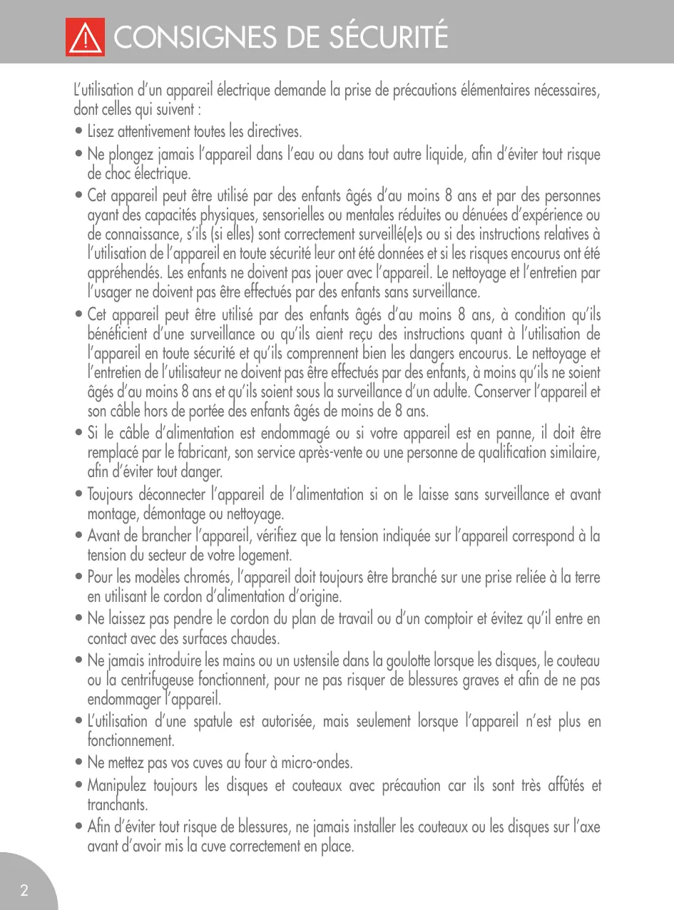 CONSIGNES DE SÉCURITÉ L’utilisation d’un appareil électrique demande la prise de précautions élémentaires nécessaires, dont celles qui suivent : • Lisez attentivement toutes les directives. • Ne plongez jamais l’appareil dans l’eau ou dans tout autre liquide, afin d’éviter tout risque de choc électrique. • Cet appareil peut être utilisé par des enfants âgés d’au moins 8 ans et par des personnes ayant des capacités physiques, sensorielles ou mentales réduites ou dénuées d’expérience ou de connaissance, s’ils (si elles) sont correctement surveillé(e)s ou si des instructions relatives à l’utilisation de l’appareil en toute sécurité leur ont été données et si les risques encourus ont été appréhendés. Les enfants ne doivent pas jouer avec l’appareil. Le nettoyage et l’entretien par l’usager ne doivent pas être effectués par des enfants sans surveillance. • Cet appareil peut être utilisé par des enfants âgés d’au moins 8 ans, à condition qu’ils bénéficient d’une surveillance ou qu’ils aient reçu des instructions quant à l’utilisation de l’appareil en toute sécurité et qu’ils comprennent bien les dangers encourus. Le nettoyage et l’entretien de l’utilisateur ne doivent pas être effectués par des enfants, à moins qu’ils ne soient âgés d’au moins 8 ans et qu’ils soient sous la surveillance d’un adulte. Conserver l’appareil et son câble hors de portée des enfants âgés de moins de 8 ans. • Si le câble d’alimentation est endommagé ou si votre appareil est en panne, il doit être remplacé par le fabricant, son service après-vente ou une personne de qualification similaire, afin d’éviter tout danger. • Toujours déconnecter l’appareil de l’alimentation si on le laisse sans surveillance et avant montage, démontage ou nettoyage. • Avant de brancher l’appareil, vérifiez que la tension indiquée sur l’appareil correspond à la tension du secteur de votre logement. • Pour les modèles chromés, l’appareil doit toujours être branché sur une prise reliée à la terre en utilisant le cordon d’alimentation d’origine. • Ne laissez pas pendre le cordon du plan de travail ou d’un comptoir et évitez qu’il entre en contact avec des surfaces chaudes. • Ne jamais introduire les mains ou un ustensile dans la goulotte lorsque les disques, le couteau ou la centrifugeuse fonctionnent, pour ne pas risquer de blessures graves et afin de ne pas endommager l’appareil. • L’utilisation d’une spatule est autorisée, mais seulement lorsque l’appareil n’est plus en fonctionnement. • Ne mettez pas vos cuves au four à micro-ondes. • Manipulez toujours les disques et couteaux avec précaution car ils sont très affûtés et tranchants. • Afin d’éviter tout risque de blessures, ne jamais installer les couteaux ou les disques sur l’axe avant d’avoir mis la cuve correctement en place. 2