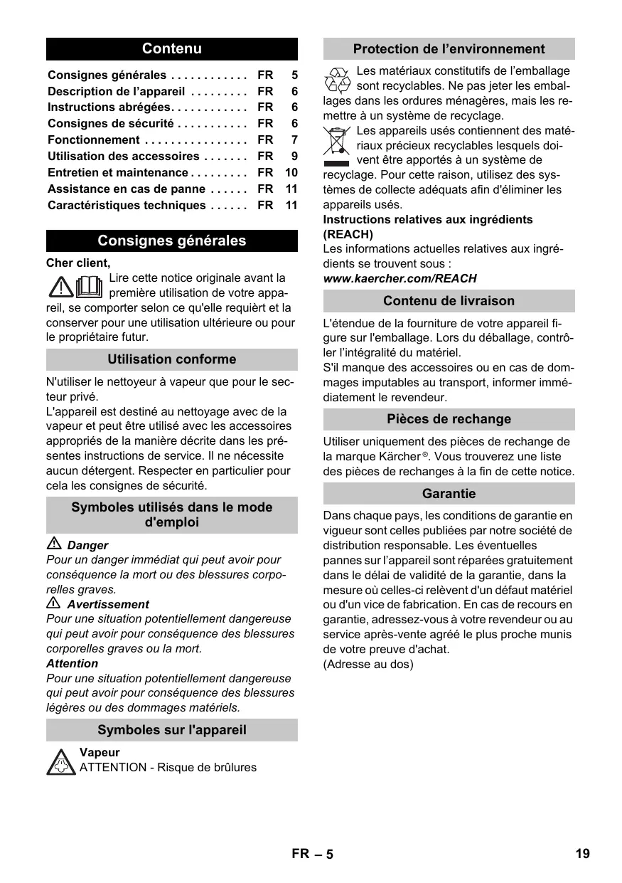 Contenu Consignes générales . . . . . . . . . . . . Français Description de l’appareil . . . . . . . . . Instructions abrégées. . . . . . . . . . . . Consignes de sécurité . . . . . . . . . . . Fonctionnement . . . . . . . . . . . . . . . . Utilisation des accessoires . . . . . . . Entretien et maintenance . . . . . . . . . Assistance en cas de panne . . . . . . Caractéristiques techniques . . . . . . Consignes générales Cher client, Lire cette notice originale avant la première utilisation de votre appareil, se comporter selon ce qu'elle requièrt et la conserver pour une utilisation ultérieure ou pour le propriétaire futur. Utilisation conforme N'utiliser le nettoyeur à vapeur que pour le secteur privé. L'appareil est destiné au nettoyage avec de la vapeur et peut être utilisé avec les accessoires appropriés de la manière décrite dans les présentes instructions de service. Il ne nécessite aucun détergent. Respecter en particulier pour cela les consignes de sécurité. Symboles utilisés dans le mode d'emploi Danger Pour un danger immédiat qui peut avoir pour conséquence la mort ou des blessures corporelles graves. 몇 Avertissement Pour une situation potentiellement dangereuse qui peut avoir pour conséquence des blessures corporelles graves ou la mort. Attention Pour une situation potentiellement dangereuse qui peut avoir pour conséquence des blessures légères ou des dommages matériels. Les matériaux constitutifs de l’emballage sont recyclables. Ne pas jeter les emballages dans les ordures ménagères, mais les remettre à un système de recyclage. Les appareils usés contiennent des matériaux précieux recyclables lesquels doivent être apportés à un système de recyclage. Pour cette raison, utilisez des systèmes de collecte adéquats afin d'éliminer les appareils usés. Instructions relatives aux ingrédients (REACH) Les informations actuelles relatives aux ingrédients se trouvent sous : www.kaercher.com/REACH Contenu de livraison L'étendue de la fourniture de votre appareil figure sur l'emballage. Lors du déballage, contrôler l’intégralité du matériel. S'il manque des accessoires ou en cas de dommages imputables au transport, informer immédiatement le revendeur. Pièces de rechange Utiliser uniquement des pièces de rechange de la marque Kärcher ®. Vous trouverez une liste des pièces de rechanges à la fin de cette notice. Garantie Dans chaque pays, les conditions de garantie en vigueur sont celles publiées par notre société de distribution responsable. Les éventuelles pannes sur l’appareil sont réparées gratuitement dans le délai de validité de la garantie, dans la mesure où celles-ci relèvent d'un défaut matériel ou d'un vice de fabrication. En cas de recours en garantie, adressez-vous à votre revendeur ou au service après-vente agréé le plus proche munis de votre preuve d'achat. (Adresse au dos) Symboles sur l'appareil Vapeur ATTENTION - Risque de brûlures FR – 5