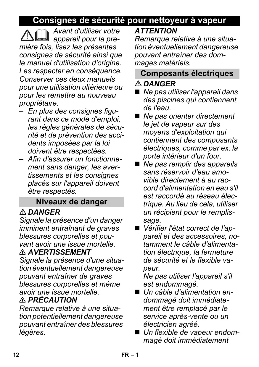 Consignes de sécurité pour nettoyeur à vapeur Avant d'utiliser votre appareil pour la première fois, lisez les présentes consignes de sécurité ainsi que le manuel d'utilisation d'origine. Les respecter en conséquence. Conserver ces deux manuels pour une utilisation ultérieure ou pour les remettre au nouveau propriétaire. – En plus des consignes figurant dans ce mode d'emploi, les règles générales de sécurité et de prévention des accidents imposées par la loi doivent être respectées. – Afin d'assurer un fonctionnement sans danger, les avertissements et les consignes placés sur l'appareil doivent être respectés. Niveaux de danger DANGER Signale la présence d'un danger imminent entraînant de graves blessures corporelles et pouvant avoir une issue mortelle. 몇 AVERTISSEMENT Signale la présence d'une situation éventuellement dangereuse pouvant entraîner de graves blessures corporelles et même avoir une issue mortelle. 몇 PRÉCAUTION Remarque relative à une situation potentiellement dangereuse pouvant entraîner des blessures légères.