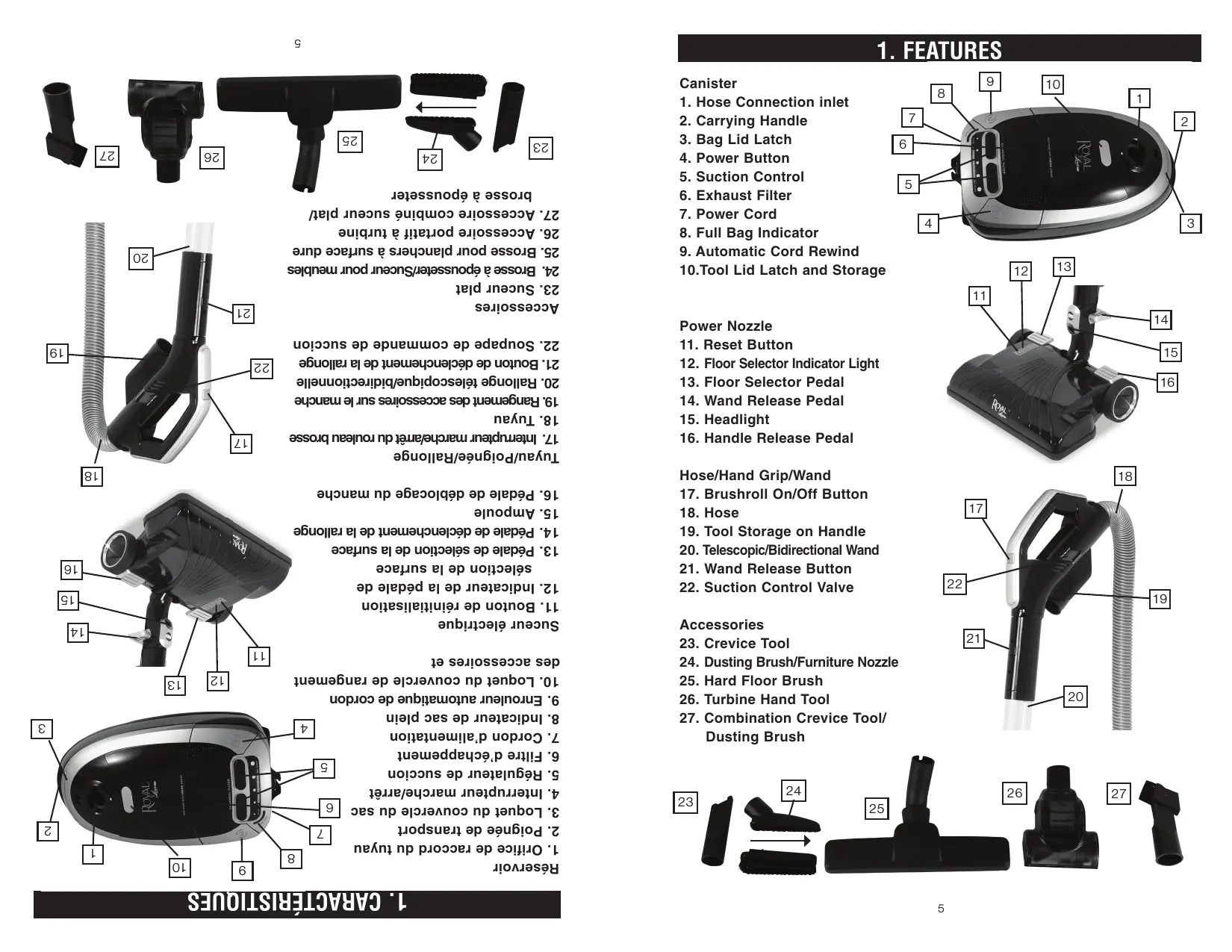 FÉLICITATIONS Consignes de sécurité.................................................................Page 2,3 Description des caractéristiques....................................................Page 5 Assemblage de l’appareil..............................................................Page 6 Installation du suceur.............................................................Page 6 Fonctionnement de l’appareil........................................................Page 7 Dégagement/enroulement du cordon......................................Page 7 Interrupteur marche/arrêt......................................................Page 7 Poignée du manche/tuyau.....................................................Page 7 Suceur électrique.................................................................Page 8 Régulateur de succion...........................................................Page 8 Nettoyage des planchers à surface dure...................................Page 9 Choix de l’accessoire approprié..............................................Page 10 Retrait et remplacement du filtre..............................................Page 11 Retrait et remplacement du sac...............................................Page 12 Rouleau brosse....................................................................Page 13 Accessoire portatif à turbine – rouleau brosse............................Page 14 Accessoire portatif à turbine – courroie.....................................Page 15 Royal Appliance Mfg. Co. garantit au consommateur que cet aspirateur est exempt de vices de matériau ou de fabrication pendant 4 années à compter de sa date d’achat d’origine. Conserver le reçu d'achat d'origine pour justifier la date d'entrée en vigueur de la période de garantie.. Troubleshooting Guide..............................................................................Page 16