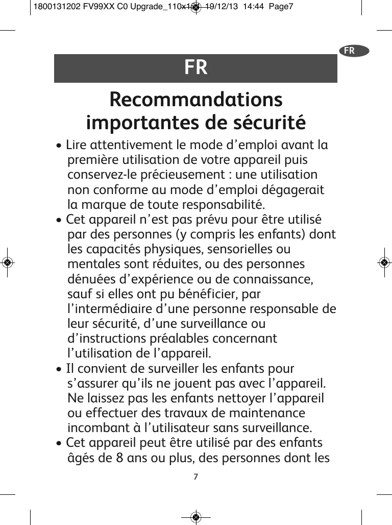 1800131202 FV99XX C0 Upgrade_110x154 19/12/13 14:44 Page8 capacités physiques, sensorielles ou mentales sont réduites, ou avec un manque d’expérience ou de connaissances, à condition de bénéficier d’une surveillance ou d’instructions préalables concernant l’utilisation sécurisée de l’appareil et de comprendre les risques encourus.
