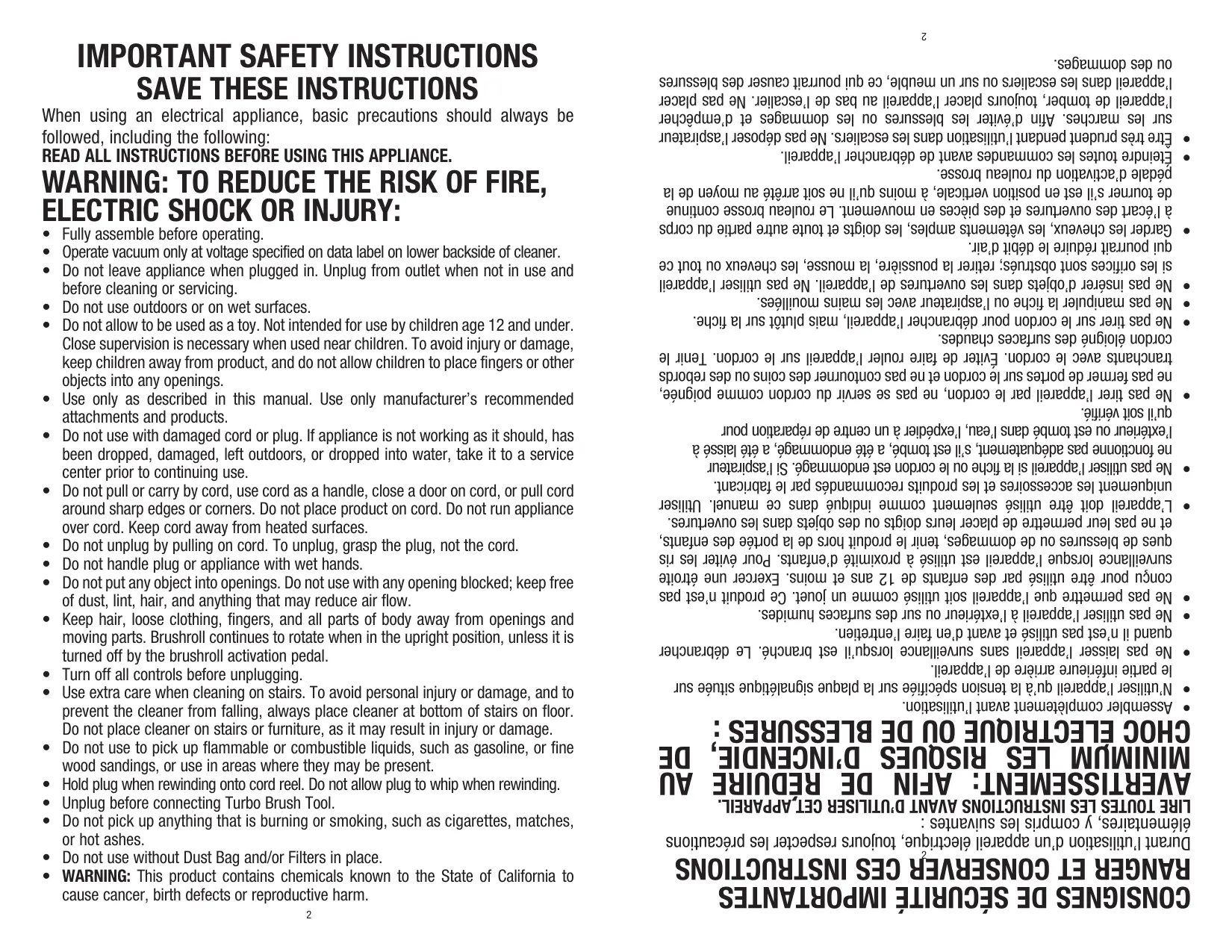 Assembler complètement avant l’utilisation. N’utiliser l’appareil qu’à la tension spécifiée sur la plaque signalétique située sur le partie inférieure arrière de l’appareil. Ne pas laisser l’appareil sans surveillance lorsqu’il est branché. Le débrancher quand il n’est pas utilisé et avant d’en faire l’entretien. Ne pas utiliser l’appareil à l’extérieur ou sur des surfaces humides. Ne pas permettre que l’appareil soit utilisé comme un jouet. Ce produit n’est pas conçu pour être utilisé par des enfants de 12 ans et moins. Exercer une étroite surveillance lorsque l’appareil est utilisé à proximité d’enfants. Pour éviter les ris ques de blessures ou de dommages, tenir le produit hors de la portée des enfants, et ne pas leur permettre de placer leurs doigts ou des objets dans les ouvertures. L’appareil doit être utilisé seulement comme indiqué dans ce manuel. Utiliser uniquement les accessoires et les produits recommandés par le fabricant. Ne pas utiliser l’appareil si la fiche ou le cordon est endommagé. Si l’aspirateur ne fonctionne pas adéquatement, s’il est tombé, a été endommagé, a été laissé à l’extérieur ou est tombé dans l’eau, l’expédier à un centre de réparation pour qu’il soit vérifié. Ne pas tirer l’appareil par le cordon, ne pas se servir du cordon comme poignée, ne pas fermer de portes sur le cordon et ne pas contourner des coins ou des rebords tranchants avec le cordon. Éviter de faire rouler l’appareil sur le cordon. Tenir le cordon éloigné des surfaces chaudes. Ne pas tirer sur le cordon pour débrancher l’appareil, mais plutôt sur la fiche. Ne pas manipuler la fiche ou l’aspirateur avec les mains mouillées. Ne pas insérer d’objets dans les ouvertures de l’appareil. Ne pas utiliser l’appareil si les orifices sont obstrués; retirer la poussière, la mousse, les cheveux ou tout ce qui pourrait réduire le débit d’air. Garder les cheveux, les vêtements amples, les doigts et toute autre partie du corps à l’écart des ouvertures et des pièces en mouvement. Le rouleau brosse continue de tourner s’il est en position verticale, à moins qu’il ne soit arrêté au moyen de la pédale d’activation du rouleau brosse. Éteindre toutes les commandes avant de débrancher l’appareil. Être très prudent pendant l’utilisation dans les escaliers. Ne pas déposer l’aspirateur sur les marches. Afin d’éviter les blessures ou les dommages et d’empêcher l’appareil de tomber, toujours placer l’appareil au bas de l’escalier. Ne pas placer l’appareil dans les escaliers ou sur un meuble, ce qui pourrait causer des blessures ou des dommages.
