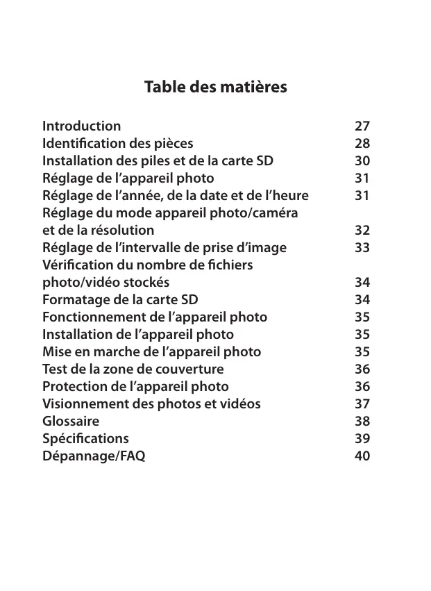Français Table des matières Introduction Identification des pièces Installation des piles et de la carte SD Réglage de l’appareil photo Réglage de l’année, de la date et de l’heure Réglage du mode appareil photo/caméra et de la résolution Réglage de l’intervalle de prise d’image Vérification du nombre de fichiers photo/vidéo stockés Formatage de la carte SD Fonctionnement de l’appareil photo Installation de l’appareil photo Mise en marche de l’appareil photo Test de la zone de couverture Protection de l’appareil photo Visionnement des photos et vidéos Glossaire Spécifications Dépannage/FAQ